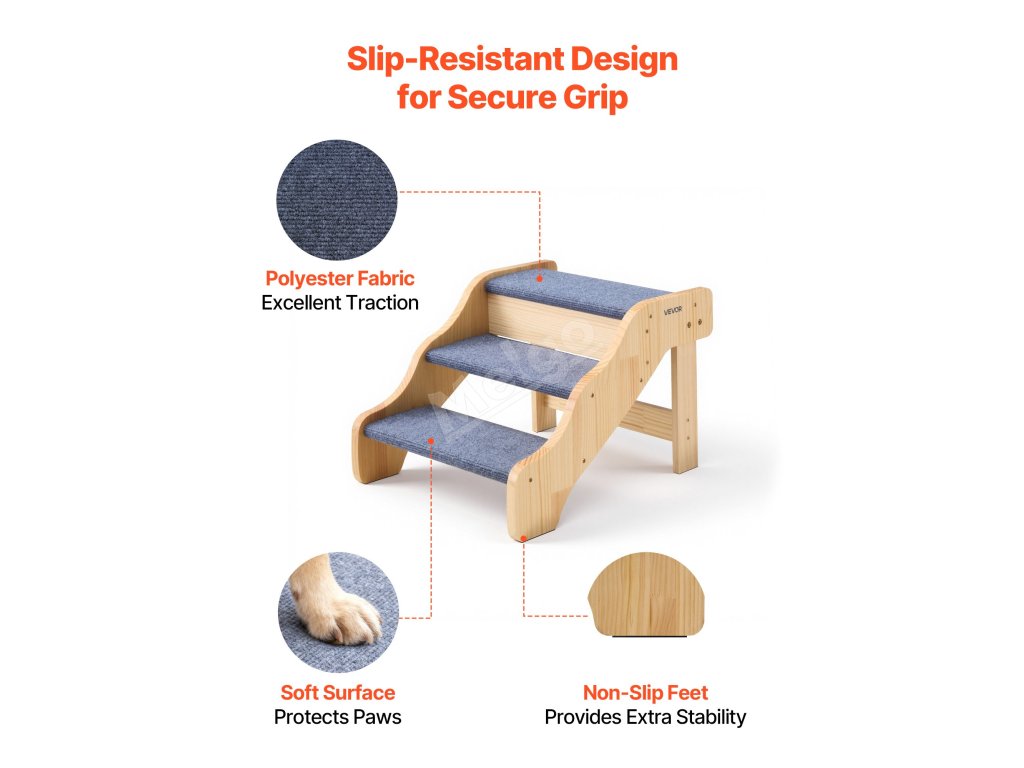 Tyto schůdky do pelíšku pro psy mají schůdky potažené látkou, které zajišťují lepší přilnavost tlapek a měkčí povrch, který pomáhá předcházet uklouznutí a zranění domácích mazlíčků.