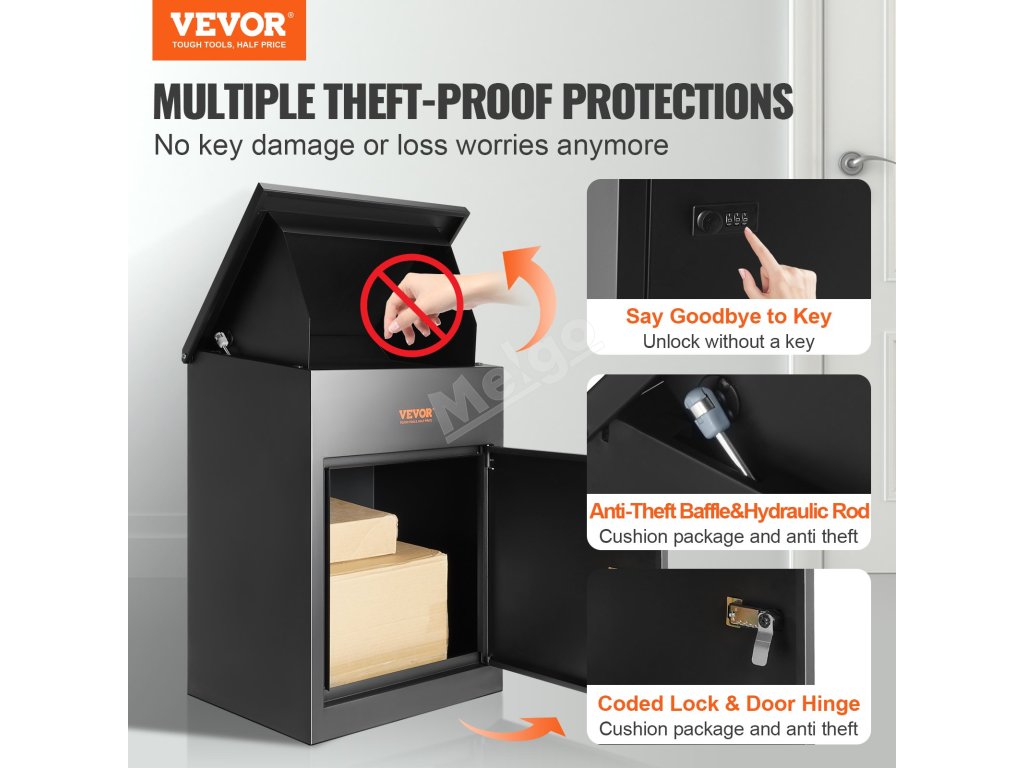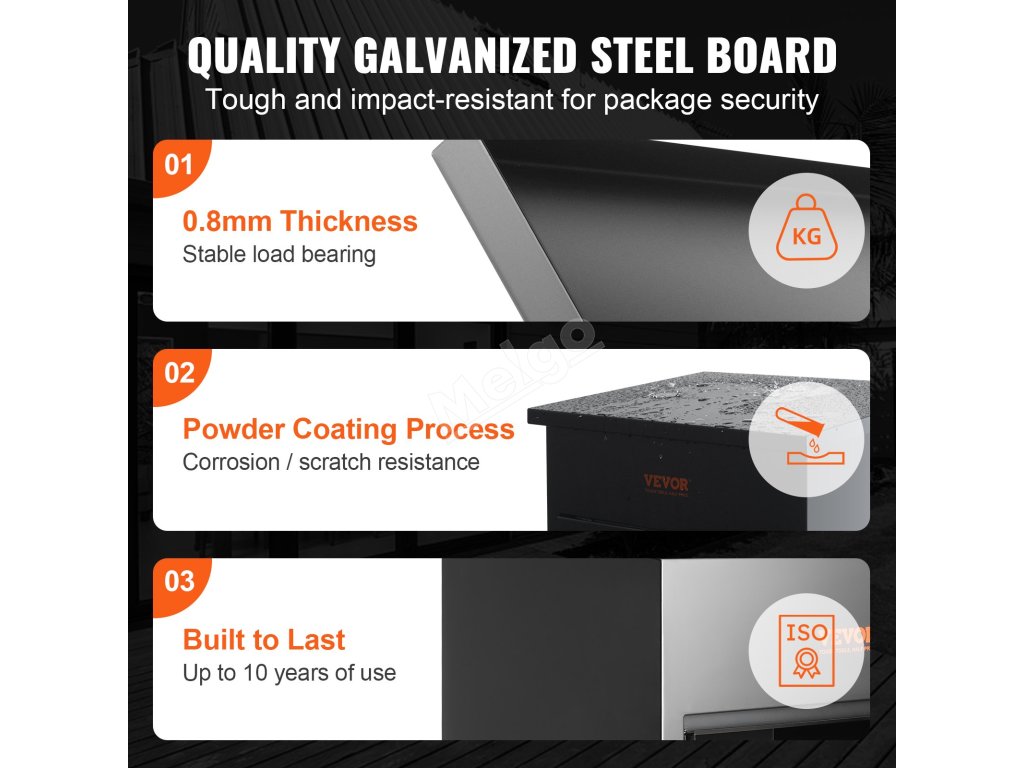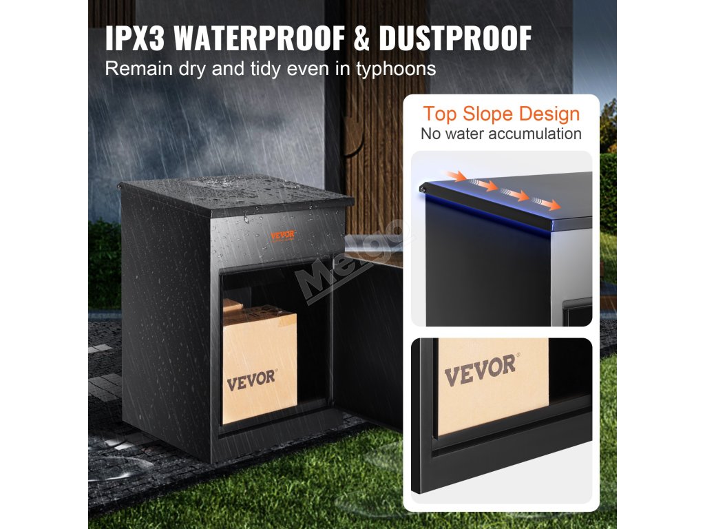 Dopřejte si schránku VEVOR proti krádeži - odborně vyrobenou z 0,8 mm silné pozinkované oceli a potaženou antikorozní vrstvou. Vodotěsný pásek s krytím IPX3 a konstrukce s horním sklonem udrží vaše zásilky v suchu a čistotě.