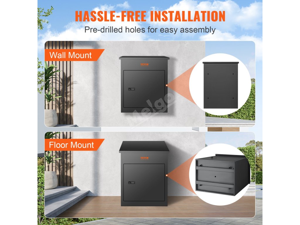 Díky 4 montážním šroubům a předvrtaným otvorům je instalace skříňky na stěnu nebo podlahu neuvěřitelně snadná, a to v pouhých třech jednoduchých krocích. Kvalitní schránka na zásilky pro použití na verandě, venku, u obrubníku.