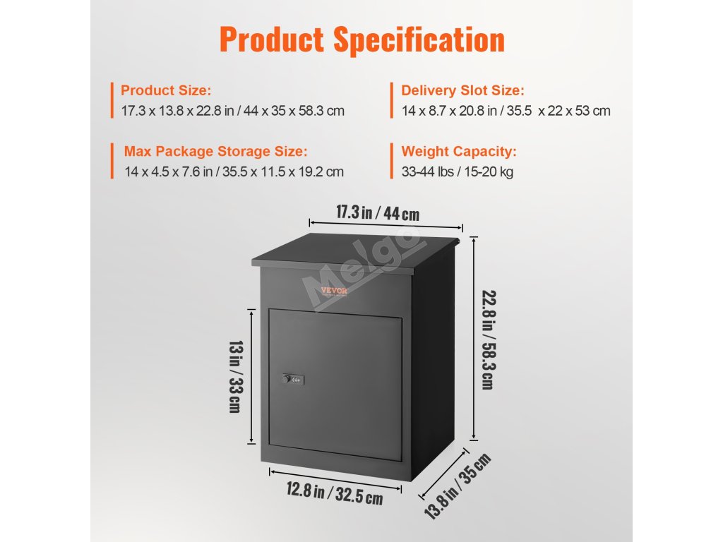 Vnější schránky na balíky VEVOR o rozměrech 17,3x13,8x22,8" jsou navrženy speciálně pro venkovní použití a poskytují celoroční ochranu pro vaši důležitou poštu a balíky. Díky pokročilému zabezpečení a robustní konstrukci bude dokonalým strážcem vašich zásilek.