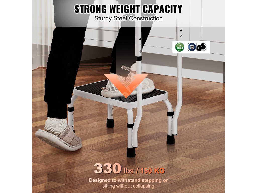 Schůdky se zábradlím jsou vyrobeny z odolné oceli, která zajišťuje vynikající stabilitu s nosností 330 lbs/150 kg, což zabraňuje posunutí a zborcení během používání.