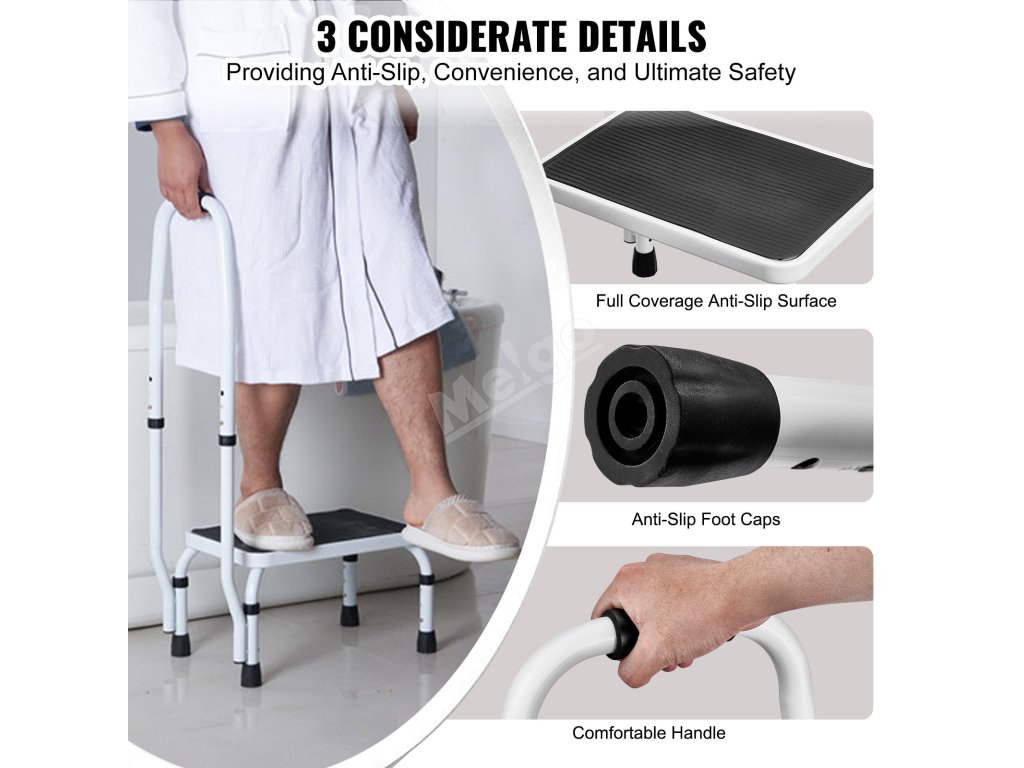 Stupátko se zábradlím využívá speciálně navržené ručně šroubované spoje k bezpečnému upevnění nohou židle a stupátka spolu s nastavitelnými nohami a zábradlím s otvorovou konstrukcí, díky čemuž instalace probíhá bez použití nářadí.