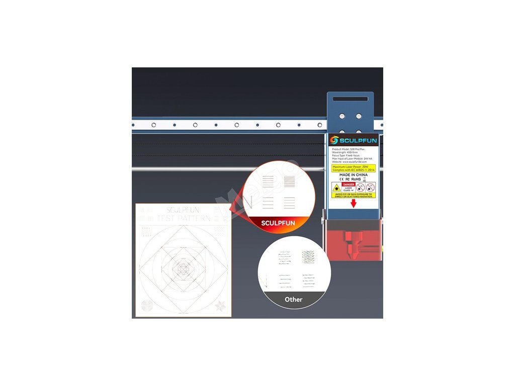 Sculpfun S30 Pro Max je vybaven 20W čtyřdiodovým laserovým modulem, pod nímž se nachází vyměnitelná ochranná čočka, která udrží vaše gravírovací zařízení v perfektním stavu po dlouhá léta!