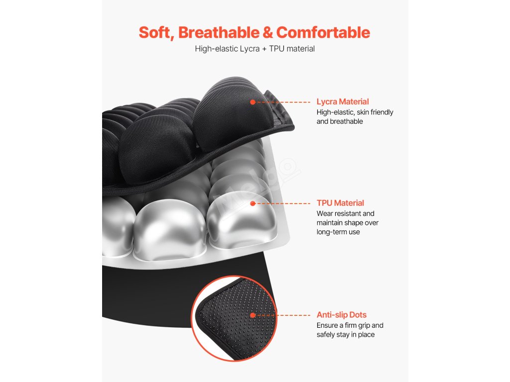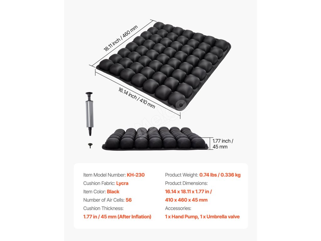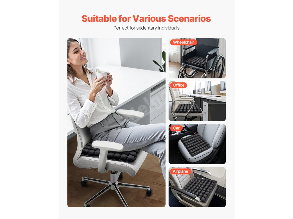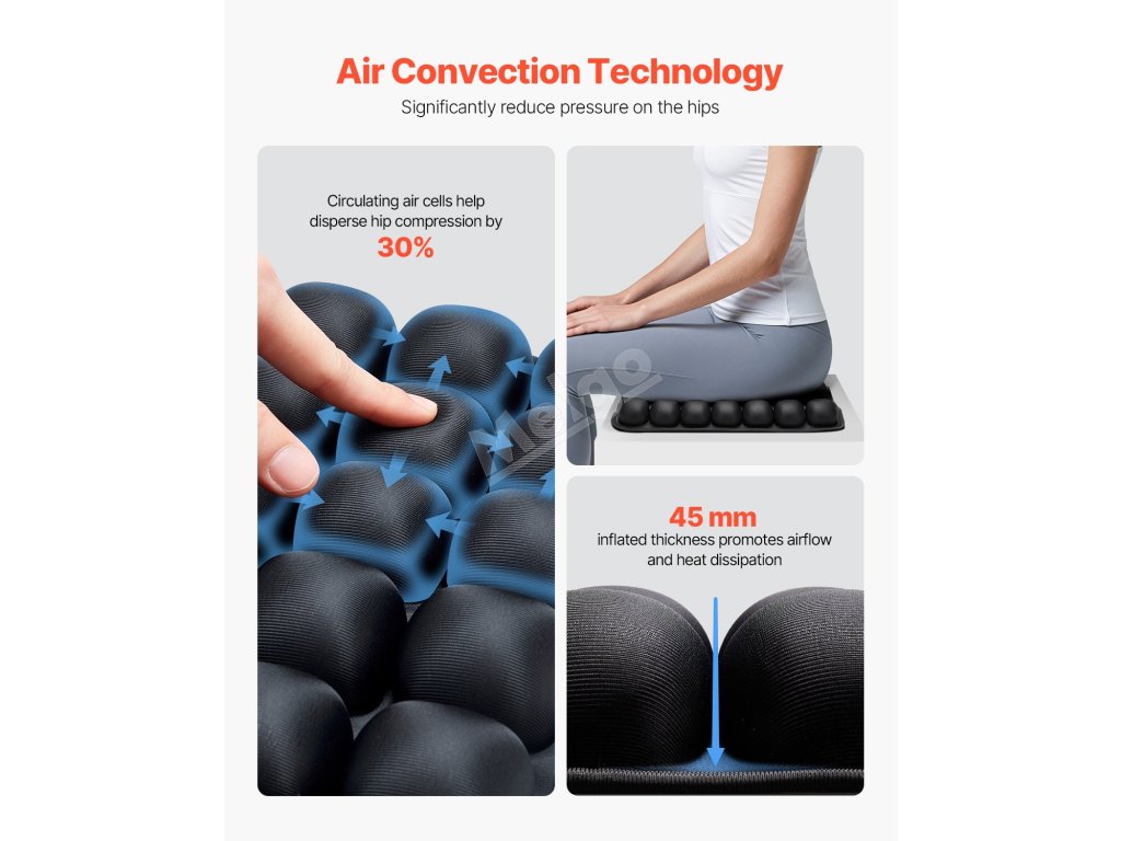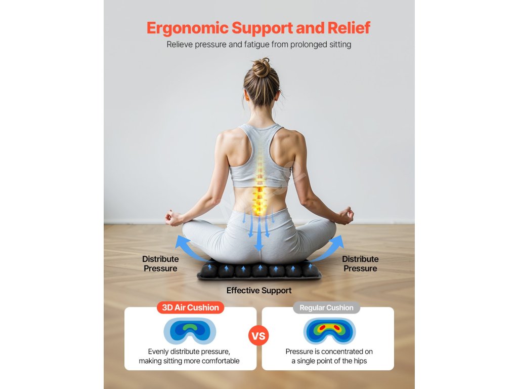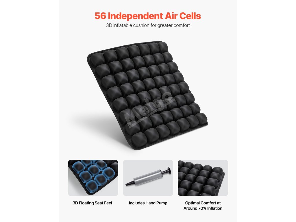 Nafukovací sedák VEVOR nabízí vynikající oporu a úlevu od tlaku díky 56 nezávislým vzduchovým buňkám, které zvyšují pohodlí při dlouhodobém sezení. Je vyroben z vysoce elastické lycry a odolného TPU, nabízí vynikající prodyšnost a odolnost a je ideální pro použití v kanceláři, autě nebo na invalidním vozíku.