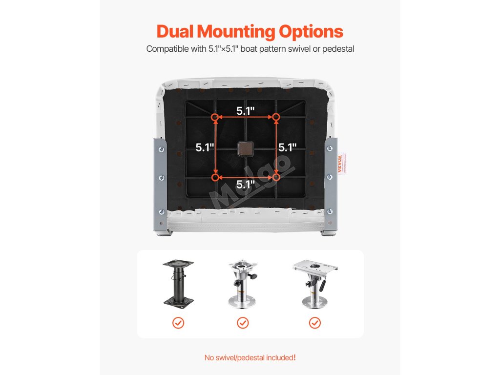 Spodní montážní otvory mají rozměry 5,1 x 5,1 palce, což umožňuje umístit sedačku rybářského člunu přímo na plošinu nebo ji připevnit na většinu podstavců. Upozornění: Otočné podstavce a podpěry nejsou součástí dodávky.