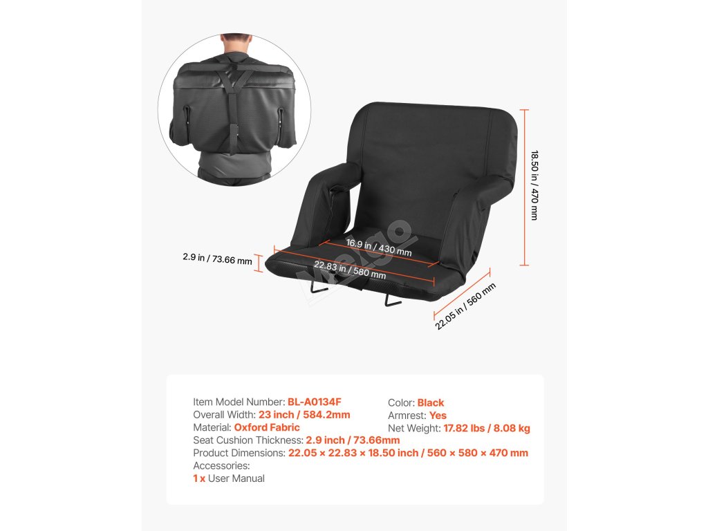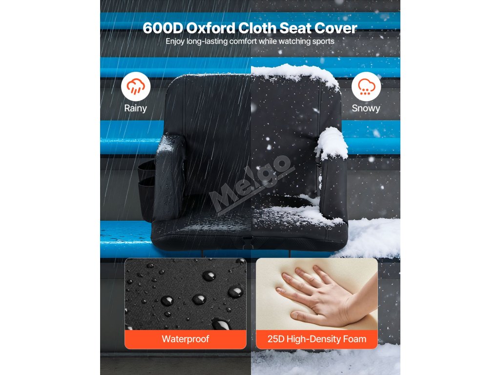 Tuto sedačku na stadion VEVOR si můžete snadno vzít s sebou, kamkoli půjdete. Její skládací konstrukce šetří místo, takže ji můžete snadno uložit do kufru auta. Sedačka nabízí šest nastavitelných poloh, takže ji můžete podle potřeby sklopit nebo naklonit tak, abyste se cítili pohodlně.