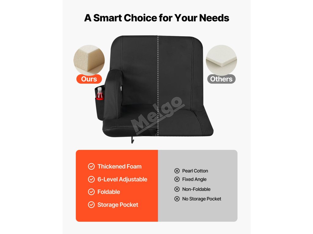 Tuto sedačku na stadion VEVOR si můžete snadno vzít s sebou, kamkoli půjdete. Její skládací konstrukce šetří místo, takže ji můžete snadno uložit do kufru auta. Sedačka nabízí šest nastavitelných poloh, takže ji můžete podle potřeby sklopit nebo naklonit tak, abyste se cítili pohodlně.