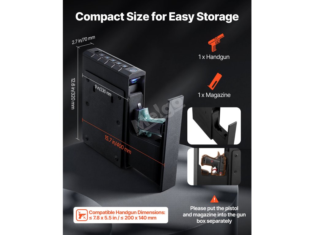 Sejf na pistoli, otisk/heslo/klíč, osvětlení, 1+zásobník, montáž