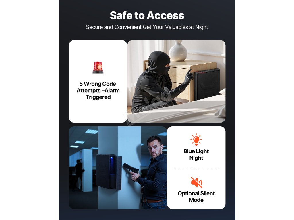 Tento trezor na zbraně zabezpečí váš domov a cennosti. Pojme 1 pistoli a 1 zásobník s přístupem pomocí otisku prstu, kódu a klíče. Noční modré světlo a tichý režim umožňují rychlé a diskrétní použití za zhoršených světelných podmínek.