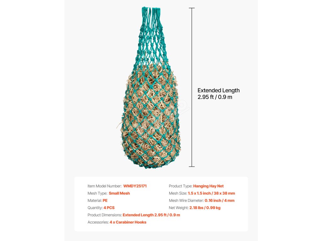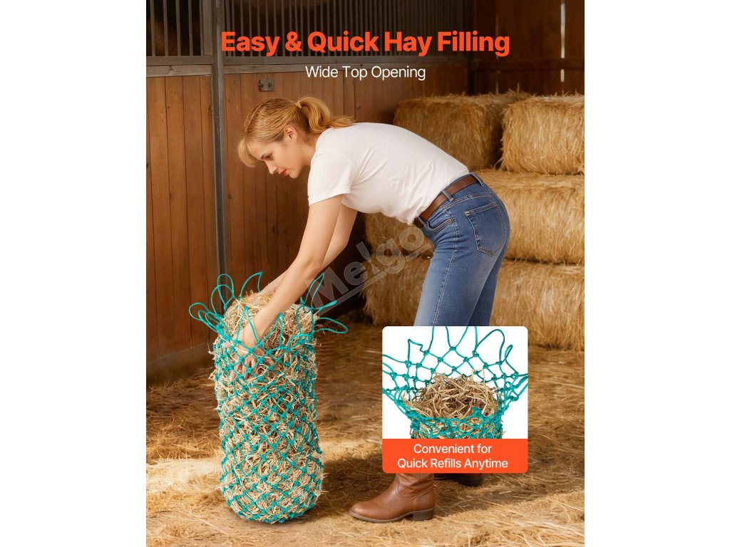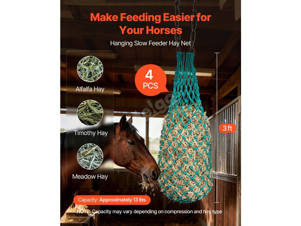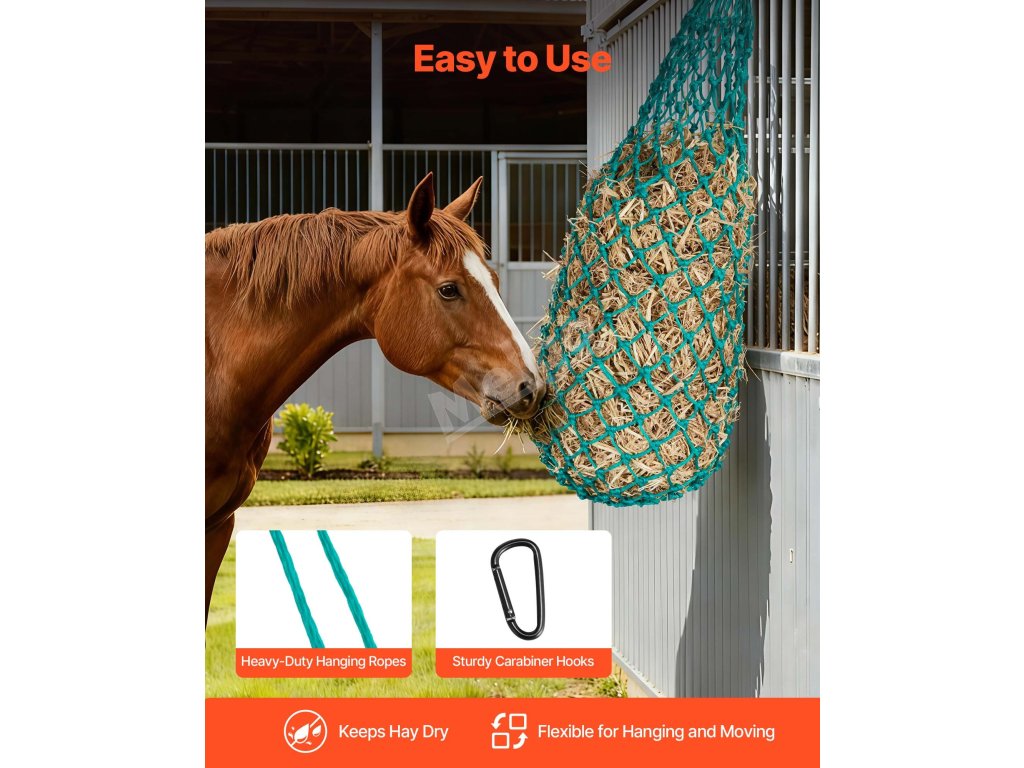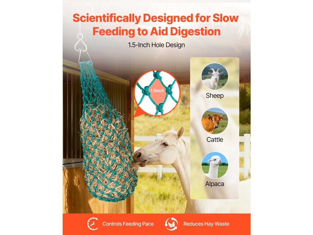 Tyto sítě na pomalé krmení pro koně s 1,5palcovými oky jsou vhodné pro většinu koní ke každodennímu použití, podporují postupné krmení, snižují množství odpadu ze sena a podporují lepší trávení.