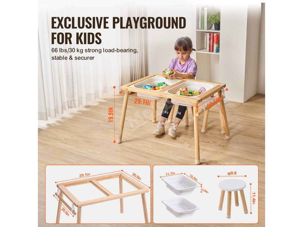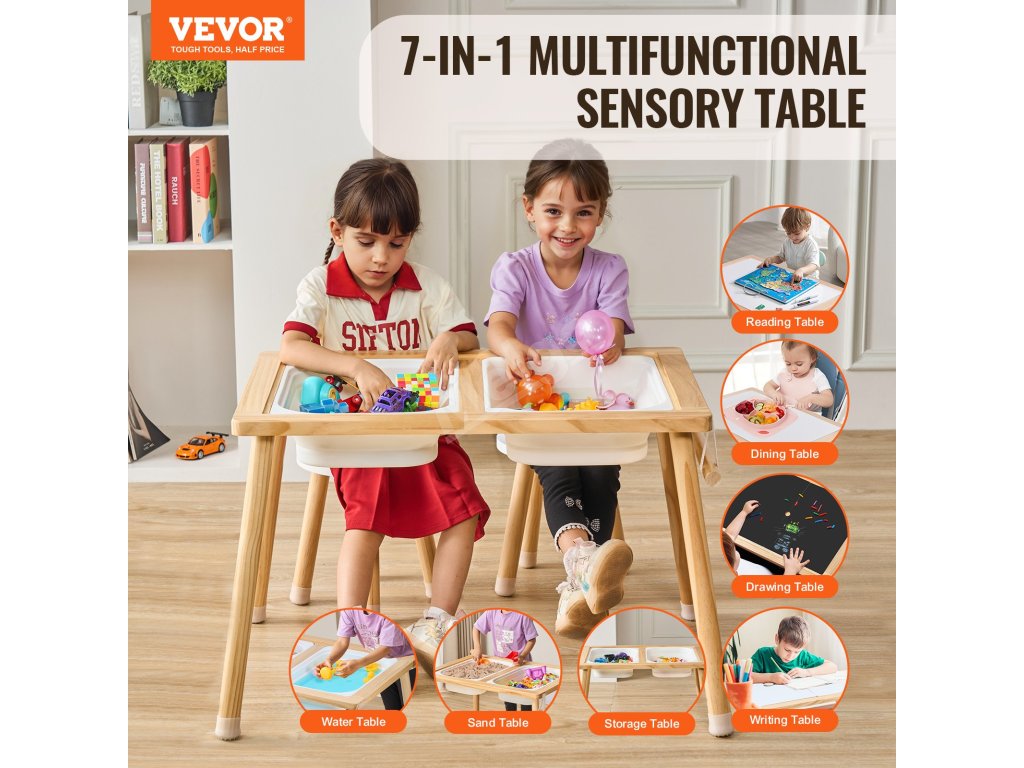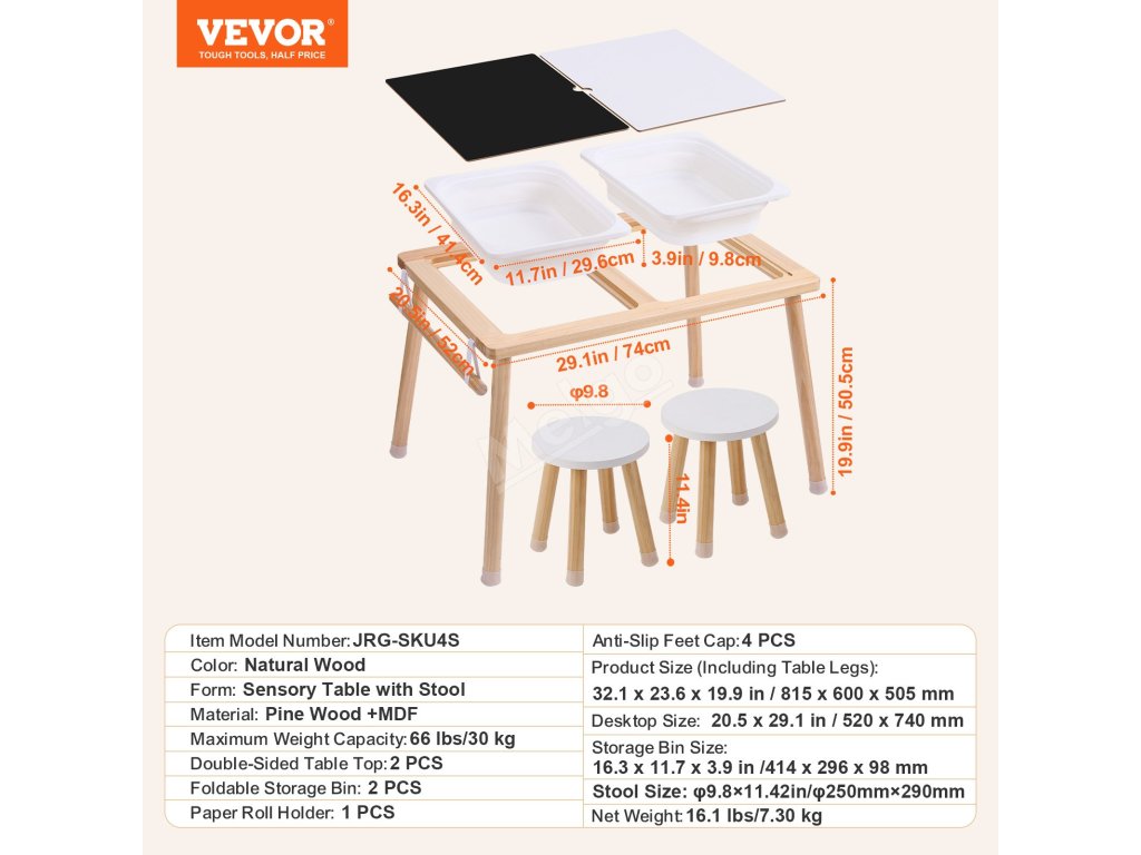 Nechte své děti objevovat, učit se a bavit se v jedné stáji! Sada dětského senzorického stolku a židle VEVOR obsahuje 2 oboustranné stolní desky, 2 židle, 1 roli papíru a 2 úložné koše, které poskytují dostatek prostoru a pohodlí pro kreslení, malování, čtení a hru s pískem a vodou.