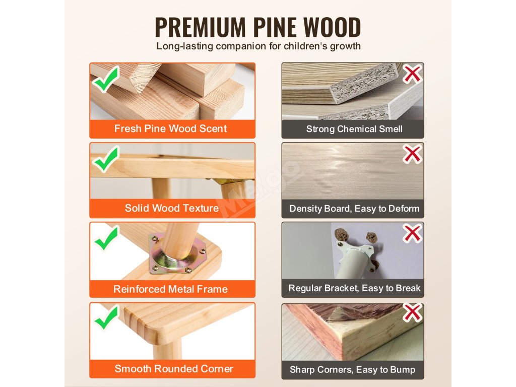 Deska stolu a nohy našeho smyslového hracího stolku jsou vyrobeny z prvotřídního borovicového dřeva, leštěného do hladka bez ostrých rohů a otřepů. Deska stolu o tloušťce 1/ 2,5 cm unese maximální hmotnost 66 liber/30 kg a roste spolu se zdravím vašeho dítěte.