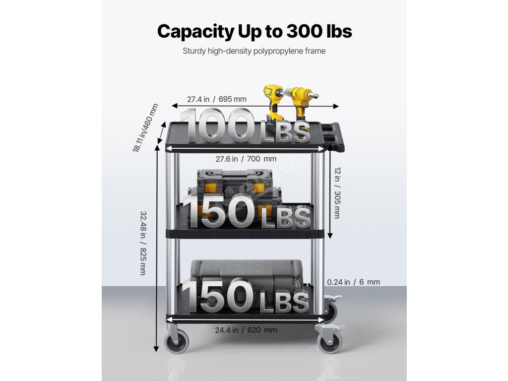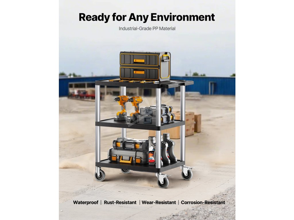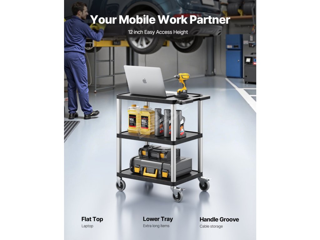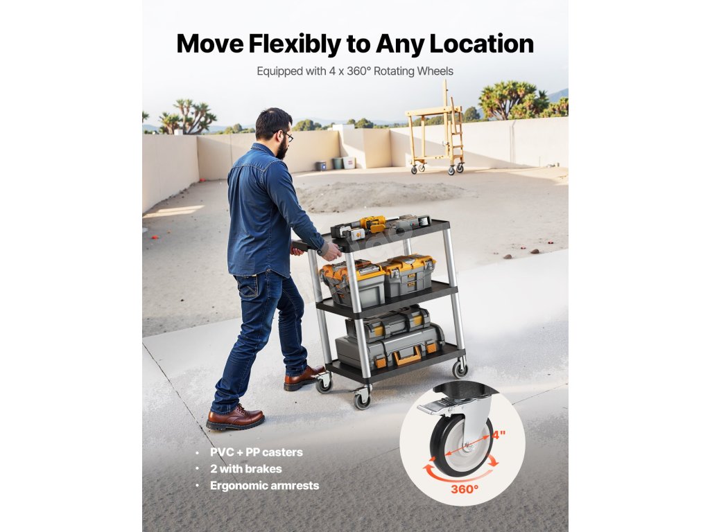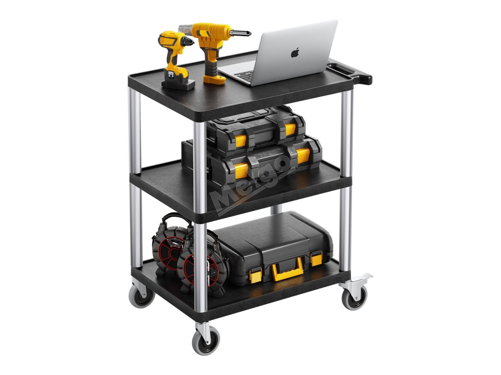 Seznamte se se svým dokonalým mobilním asistentem! Tento užitkový vozík unese až 300 kg, takže je ideálním řešením pro ukládání nářadí, vybavení a dílů. Díky 4 hladkým otočným kolečkům jej můžete přemístit kamkoli, od kanceláře až po sklad, aniž byste se zapotili.