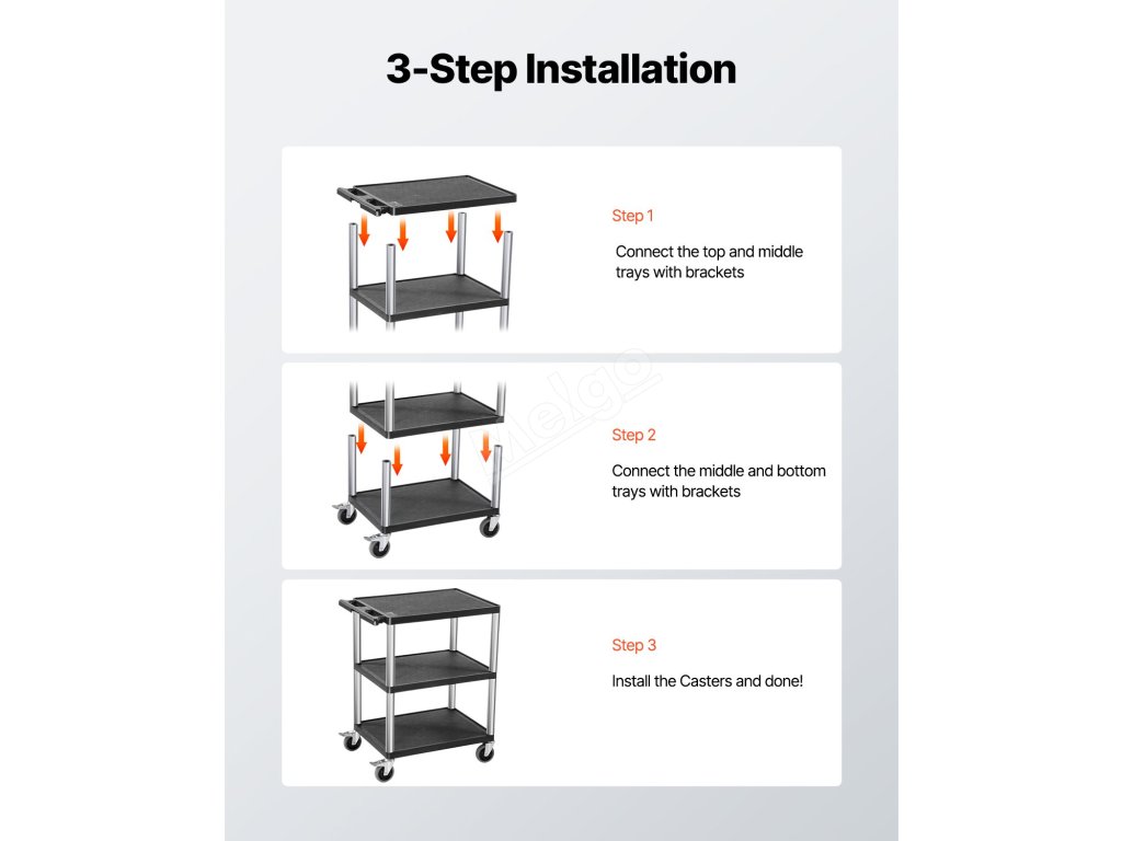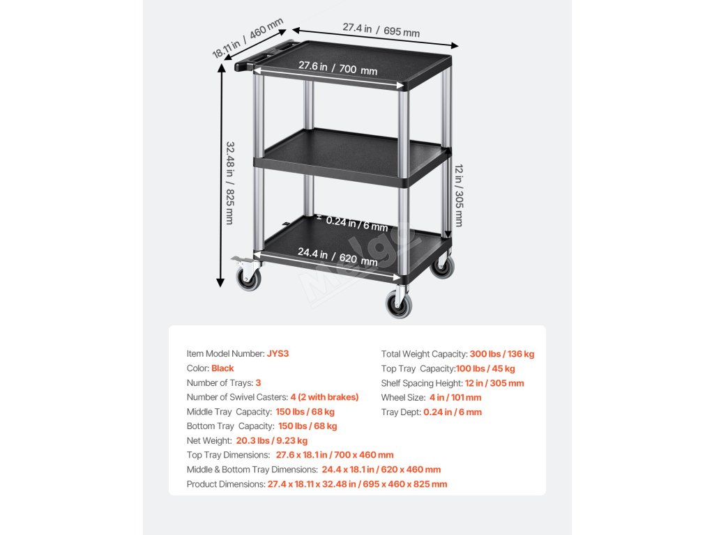 Servisní vozík 3 police, nosnost 300 lbs, 27.6×18.1" 360° (2 s brzdou)