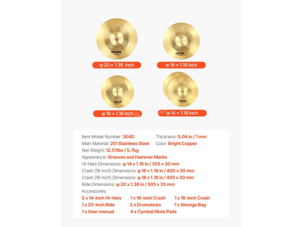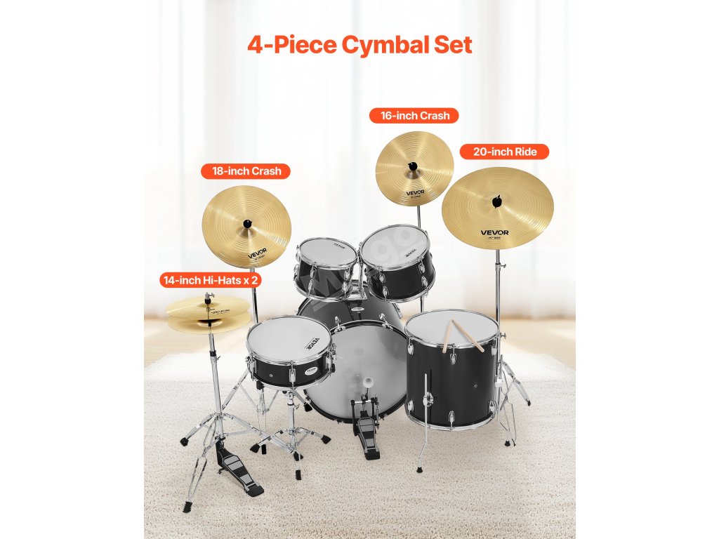 Tato činelová sada obsahuje 4 činely: 14palcový Hi-Hat, 16palcový Crash, 18palcový Crash a 20palcový Ride. Dále 2 paličky, 1 úložný vak a 6 tichých podložek. Díky jasným tónům, různým stylům a odolnosti je skvělý pro začátečníky!