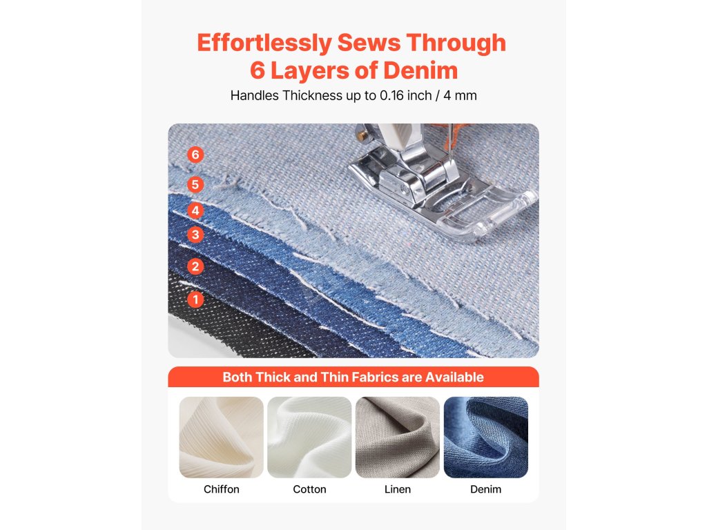 Díky odolnému celokovovému vnitřnímu rámu zůstává tento šicí stroj s nožním pedálem stabilní při vysokorychlostním nebo náročném šití. Ve spojení s výkonným motorem si snadno a spolehlivě poradí s látkami o tloušťce až 0,16 palce, včetně lnu, šifonu a silných tkanin.