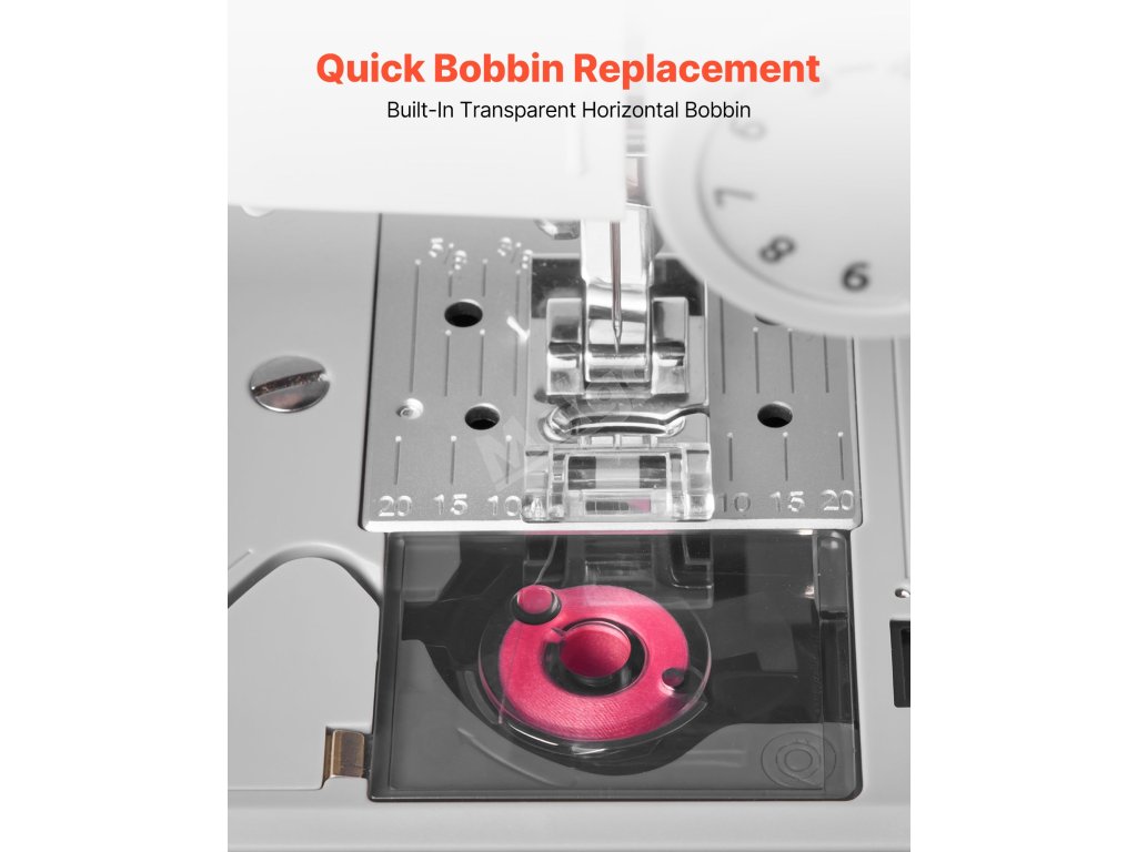 Průhledná vodorovná cívka usnadňuje sledování a doplňování nití. LED světlo rozjasní vaši pracovní plochu a automatický navlékač jehly šetří čas. Rychlost šití si nastavíte pomocí nožního pedálu, a to až na 700 stehů za minutu.
