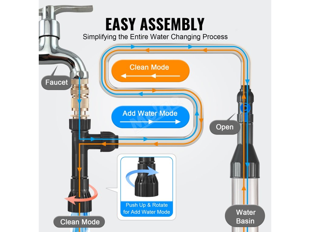 Nepotřebuje elektrickou energii, k čerpání využívá rozdíl tlaku vody a zároveň zajišťuje čištění akvária. Jednoduše nastavte ventil pro přidání vody, čímž realizujete účinnou poloautomatickou výměnu vody v akváriu.