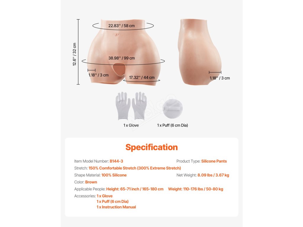 Naše silikonové zadečky kombinují pohodlí a realističnost. Jsou vyrobeny ze 100% silikonu, jsou měkké, příjemné na dotek a skvěle se natahují a jsou ideální pro nadšence cosplay, drag queens, filmová a televizní natáčení. Zvyšte si sebevědomí a vzhled s našimi výjimečnými kalhotkami na zvětšení boků.