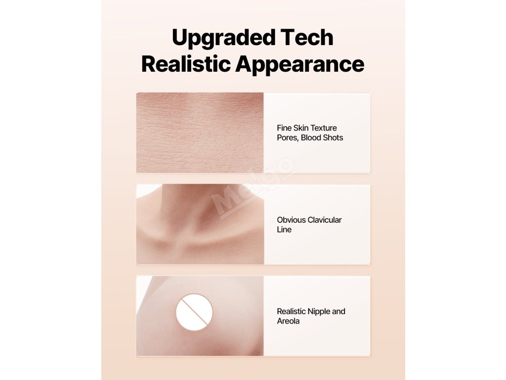 Vysoký stupeň simulácie dizajnu, ktorý dokonale kopíruje prirodzenú krásu. Jemná štruktúra pokožky prináša realistický dotyk a vizuálny efekt; vzpriamený tvar prsníkov zvýrazňuje elegantné krivky; jasné a prirodzené línie kľúčnych kostí umocňujú celkový realistický vzhľad.