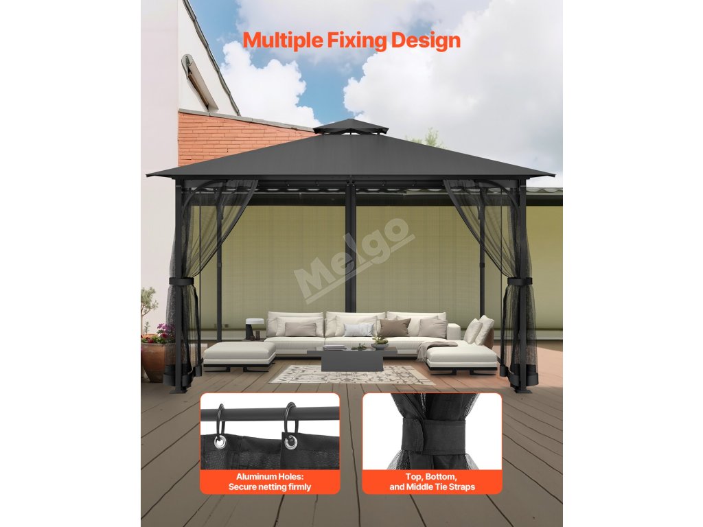 Díky hliníkovým upevňovacím otvorům v horní části je tato zástěna altánu stabilnější a odolnější než tradiční polyesterové tkaniny. V kombinaci s háčky a kroužky se snadno instaluje a bezpečně připevňuje k rámu altánu, čímž udržuje váš venkovní prostor uklizený a organizovaný.