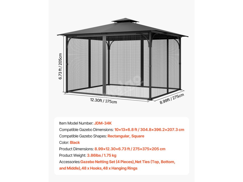 | Kompatibilné rozmery altánku | 10 × 13 × 6,8 ft / 304,8 × 396,2 × 207,3 cm |