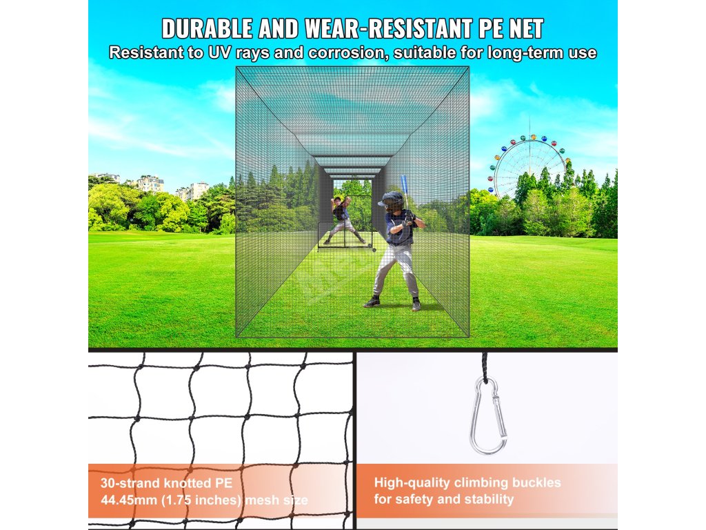 Pálkařská síť se vyznačuje vynikající odolností proti povětrnostním vlivům, je vhodná pro použití v jakýchkoli podmínkách. Je UV stabilizovaná, aby se zabránilo poškození slunečním zářením, materiál PE je odolný proti opotřebení a korozi, což zajišťuje dlouhou životnost.