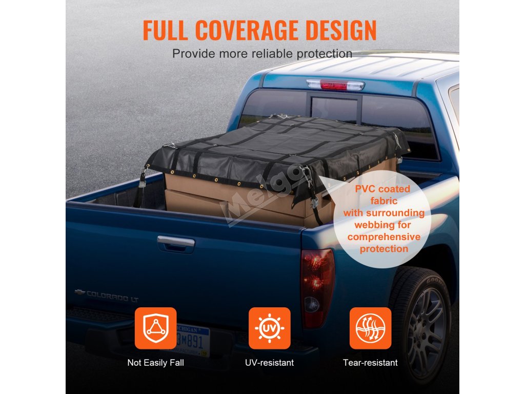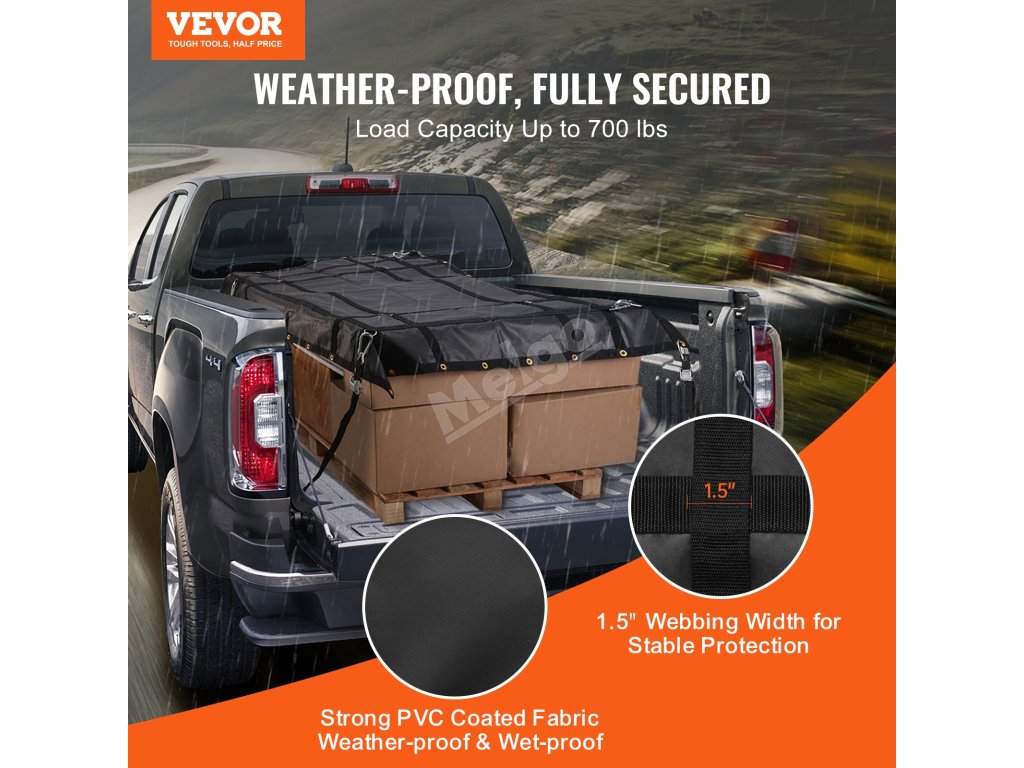 Síť na náklad VEVOR má nosnost až 700 kg, takže si snadno poradí se všemi druhy extrémního větru a deště a zajistí váš náklad před promočením a poškozením.