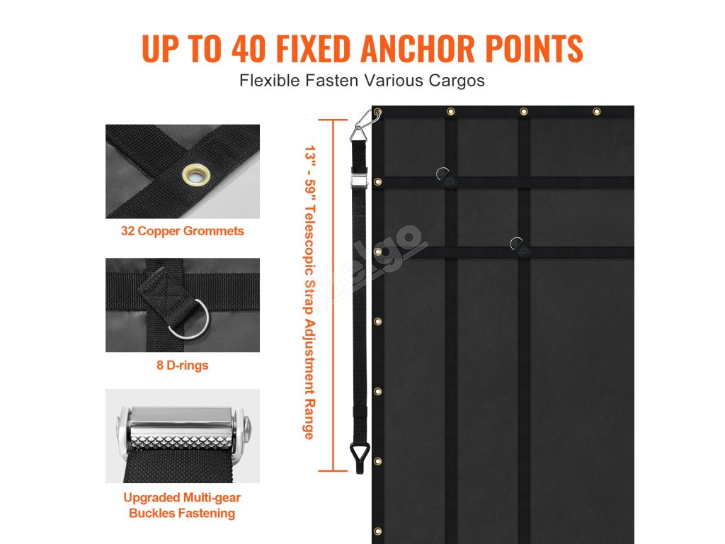 Naše odolná síť na náklad má až 40 kovových upevňovacích bodů a až 59" dlouhé nastavitelné teleskopické popruhy. Nákladní síť se přizpůsobí potřebám upevnění nákladu různých velikostí a tvarů a udrží náklad v bezpečí, aniž by se posunul.