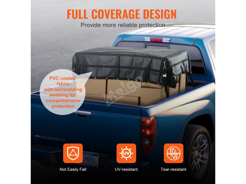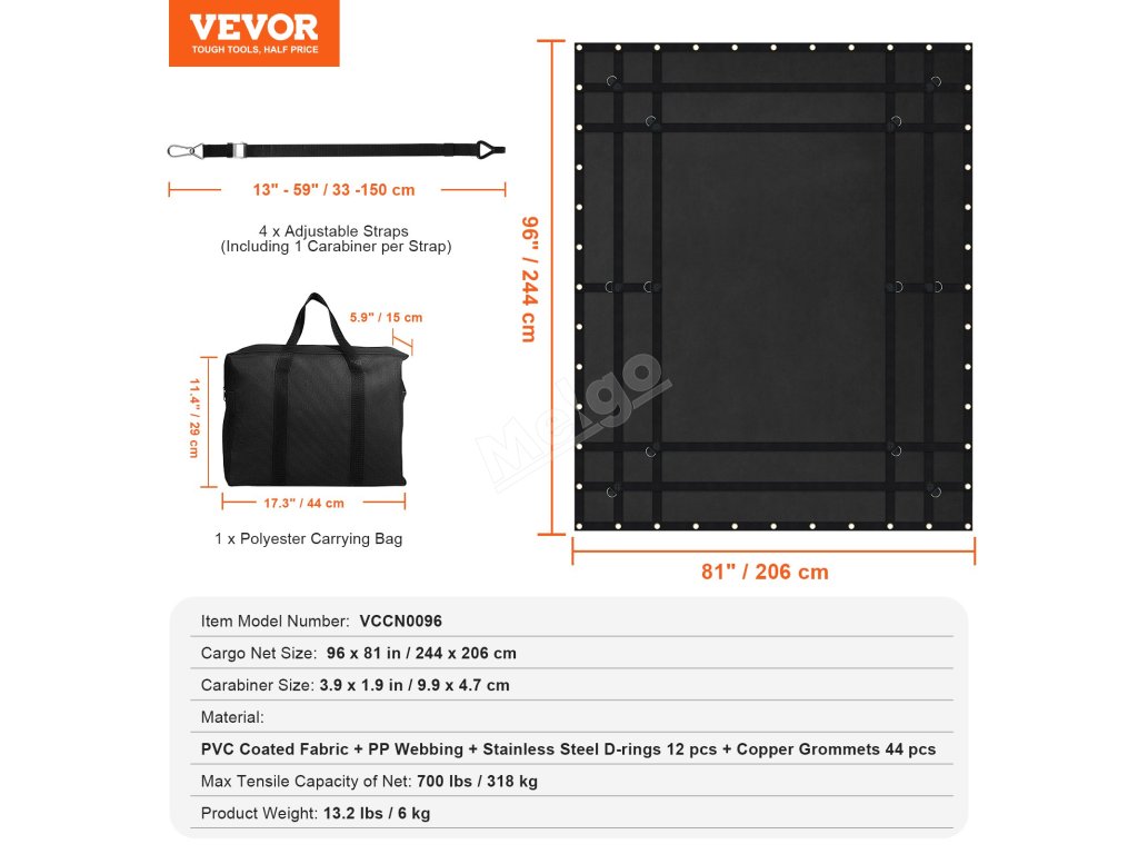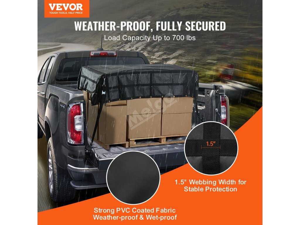 Síť na náklad VEVOR má nosnost až 700 kg, takže si snadno poradí se všemi druhy extrémního větru a deště a zajistí váš náklad před promočením a poškozením.