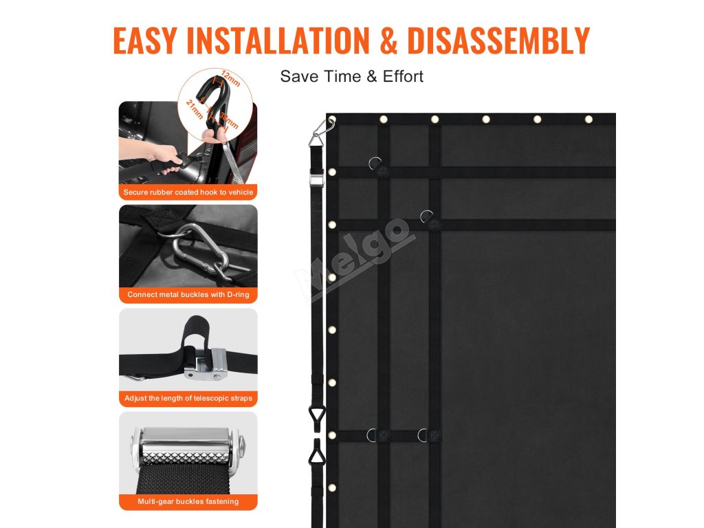 Pomocí háčků s pogumovaným povrchem v příslušenství připevněte síť na náklad k vozidlu. Žádné další nářadí není potřeba. Síť na náklad v ložné ploše nákladního automobilu je vhodná pro nákladní automobily, přívěsy, pickupy, SUV, džípy, a dokonce i pro lodě k zajištění předmětů.