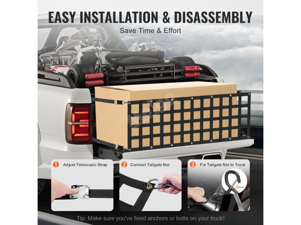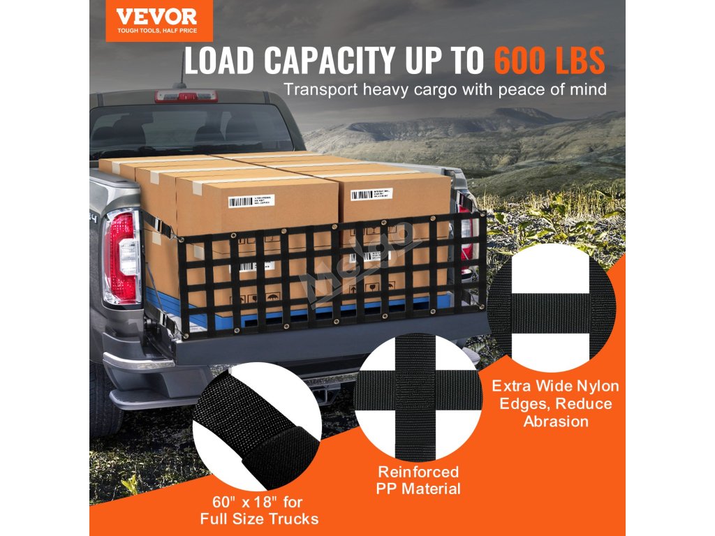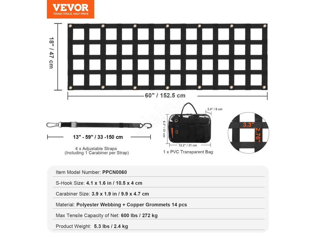 Síť na zadní dveře VEVOR má nosnost až 600 kg, rozměry 60" x 18" jsou vhodnější pro nákladní automobily plné velikosti. Kromě toho je naše síť na zadní dveře vhodná také pro upevnění různých extra dlouhých a těžkých nákladů, díky čemuž je přeprava nákladu bezpečnější.