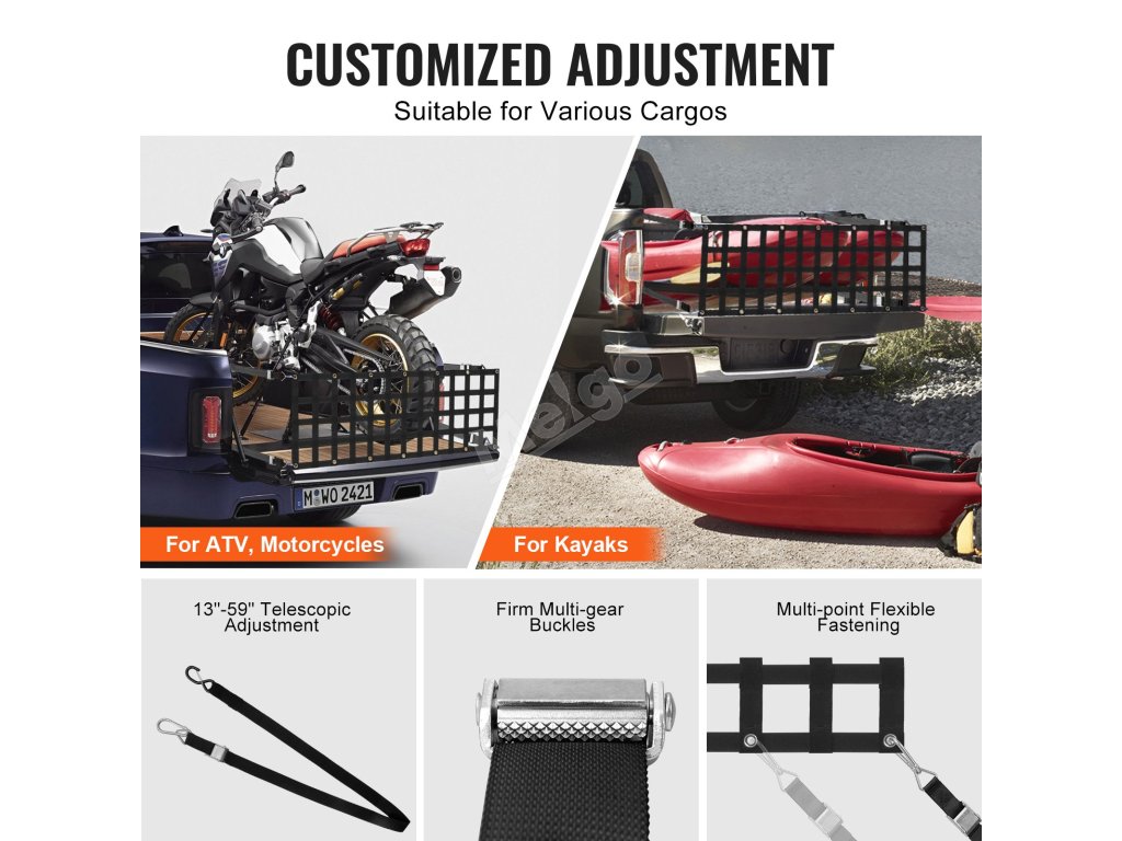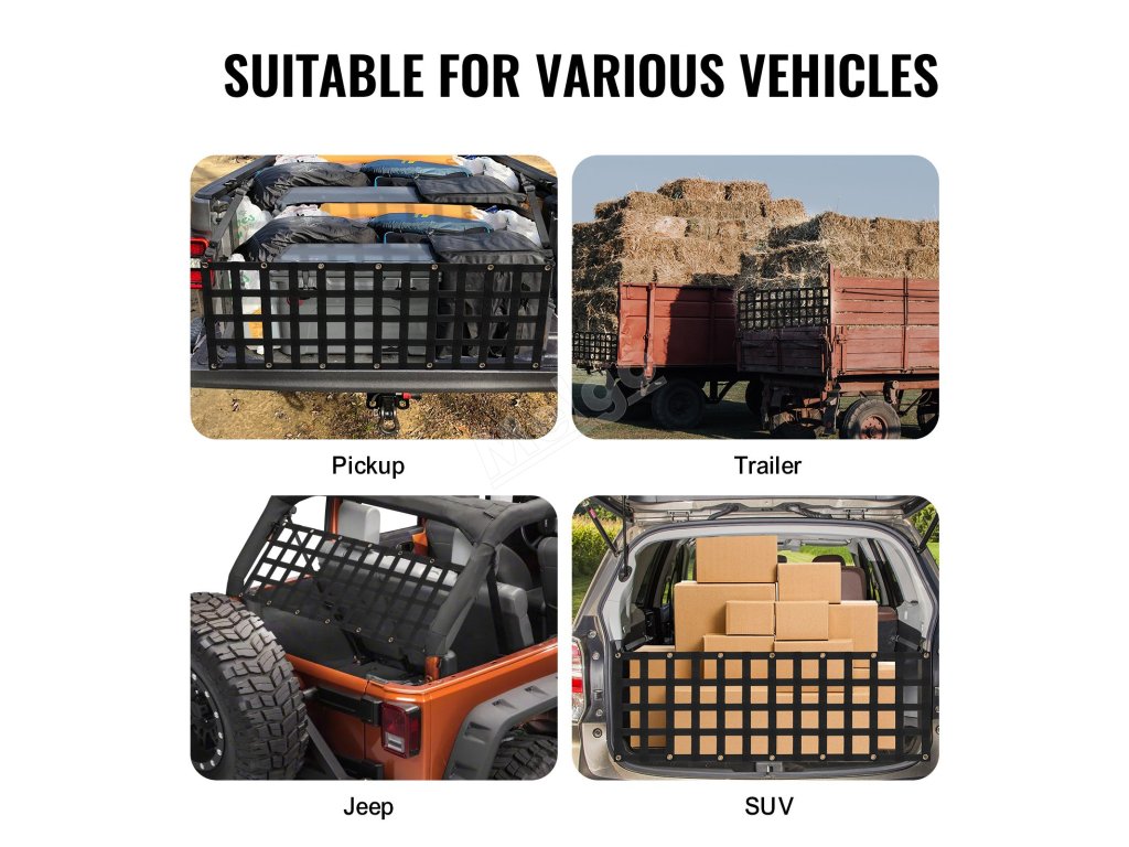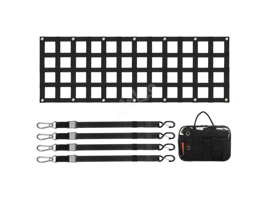 Naše síť na zadní dveře je vybavena 4 nastavitelnými teleskopickými popruhy o délce až 59" a 14 kovovými montážními oky. Můžete na ni připevnit předměty různých velikostí a tvarů podle svých potřeb a rozšířit tak kapacitu zavazadlového prostoru svého vozidla.