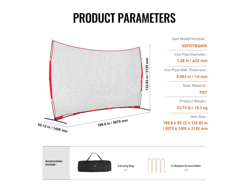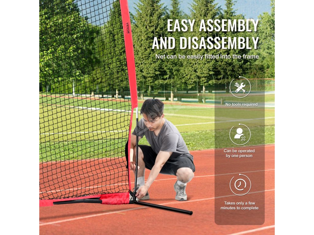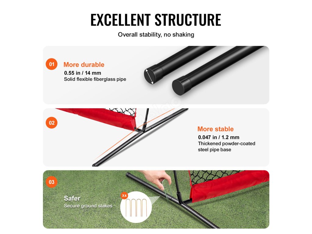 Tato přenosná tréninková síť využívá silné pružné tyče ze skleněných vláken, zesílenou základnu z práškově lakovaných ocelových trubek a bezpečné kolíky v zemi, které jsou stabilní a zatížené, což výrazně zvyšuje bezpečnost při sportu.