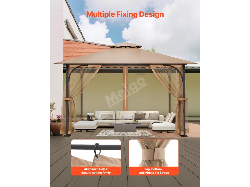 Díky hliníkovým upevňovacím otvorům v horní části je tato zástěna altánu stabilnější a odolnější než tradiční polyesterové tkaniny. V kombinaci s háčky a kroužky se snadno instaluje a bezpečně připevňuje k rámu altánu, čímž udržuje váš venkovní prostor uklizený a organizovaný.