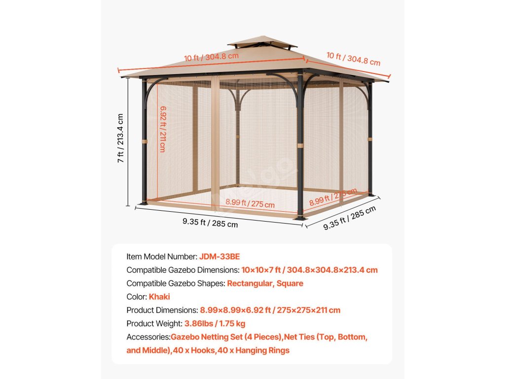 | Kompatibilné rozmery altánku | 10 × 10 × 7 stôp / 304,8 × 304,8 × 213,4 cm |