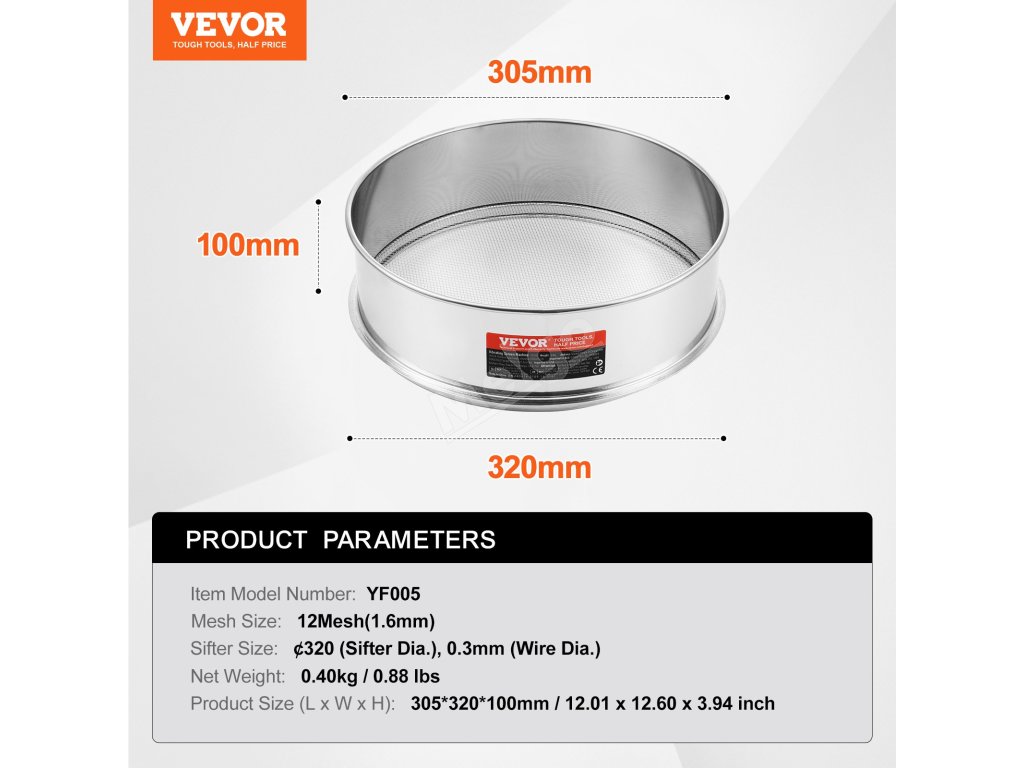 | Velikost sítka | 320 mm (průměr síta), 0,3 mm (průměr drátu) |