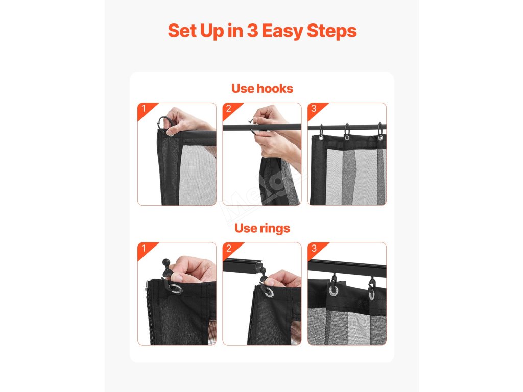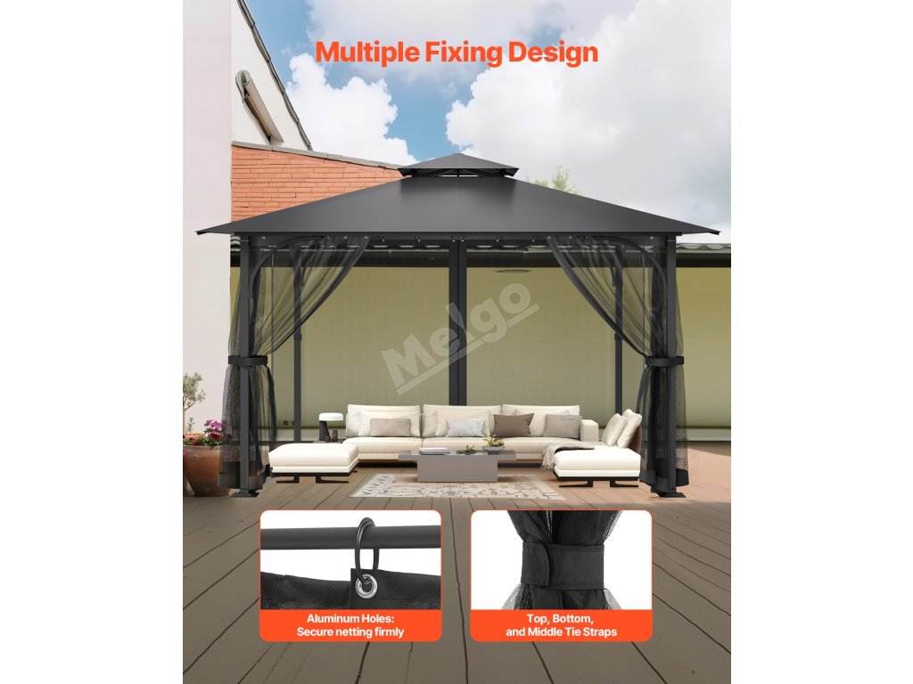 Díky hliníkovým upevňovacím otvorům v horní části je tato zástěna altánu stabilnější a odolnější než tradiční polyesterové tkaniny. V kombinaci s háčky a kroužky se snadno instaluje a bezpečně připevňuje k rámu altánu, čímž udržuje váš venkovní prostor uklizený a organizovaný.