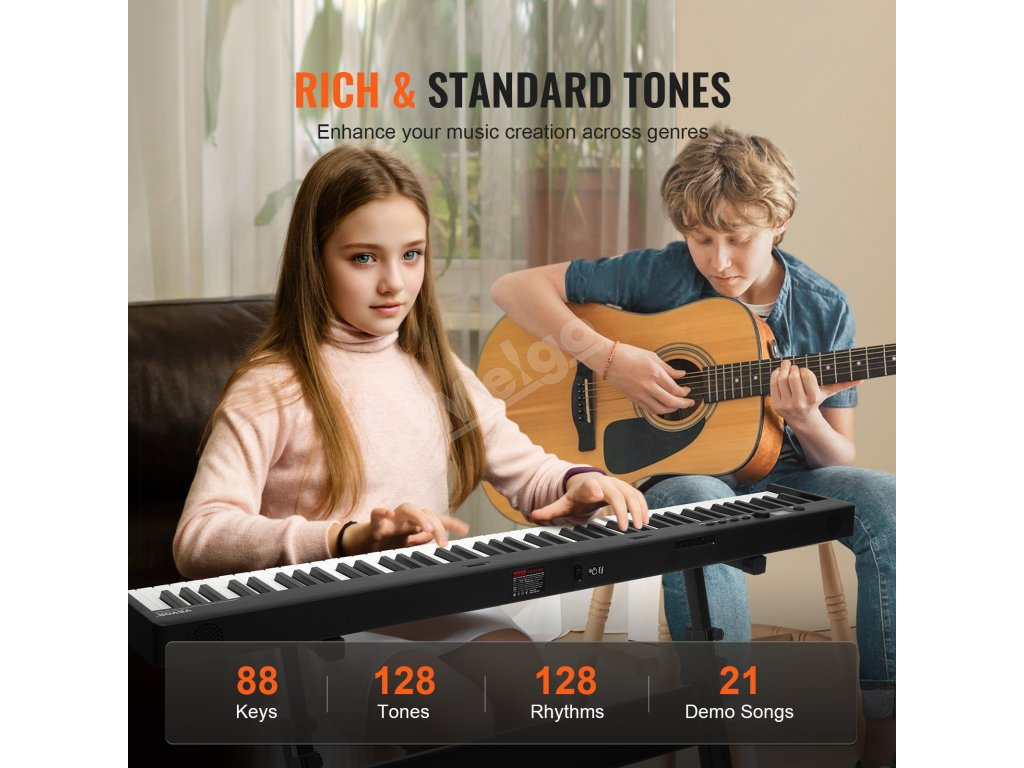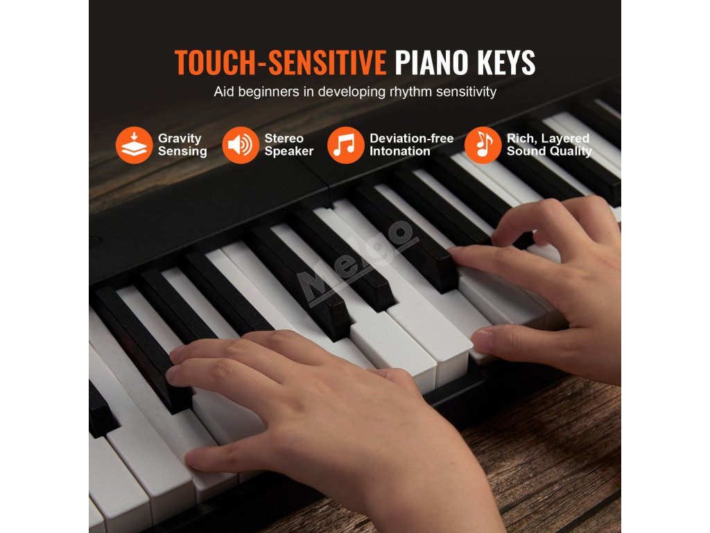 Toto skládací piano se 128 notami umožňuje hrát různé zvuky nástrojů přímo z klaviatury. Rozložení 88 kláves v kombinaci s pedálem a funkcí sustain přináší autentický zážitek ze hry na klavír, což z něj činí ideální nástroj pro výuku a učení hudby.