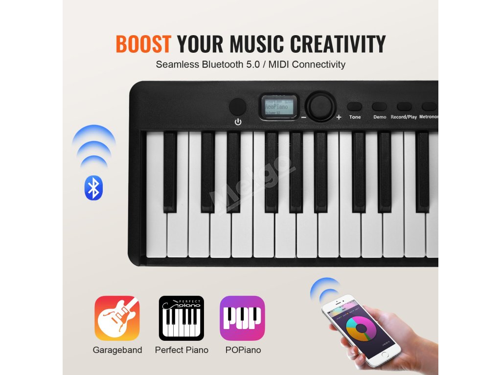 Uvolněte svůj hudební potenciál díky všestranným možnostem připojení. Naše skládací klávesy jsou vybaveny rozhraním MIDI a Bluetooth 5.0, které zajišťuje efektivní přenos pro bezproblémovou úpravu hudby.