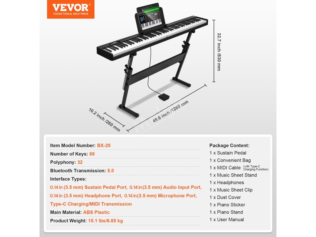 Naše přenosné piano má skládací konstrukci o 180°. Připojte se přes Bluetooth, MIDI nebo USB a užívejte si hudbu přes smartphone nebo sluchátka kdekoli! Ponořte se do světa hudby díky nastavitelnému stojanu, 128 tónům a mezinárodním standardním rytmům, stereo reproduktoru a digitálnímu LED displeji.