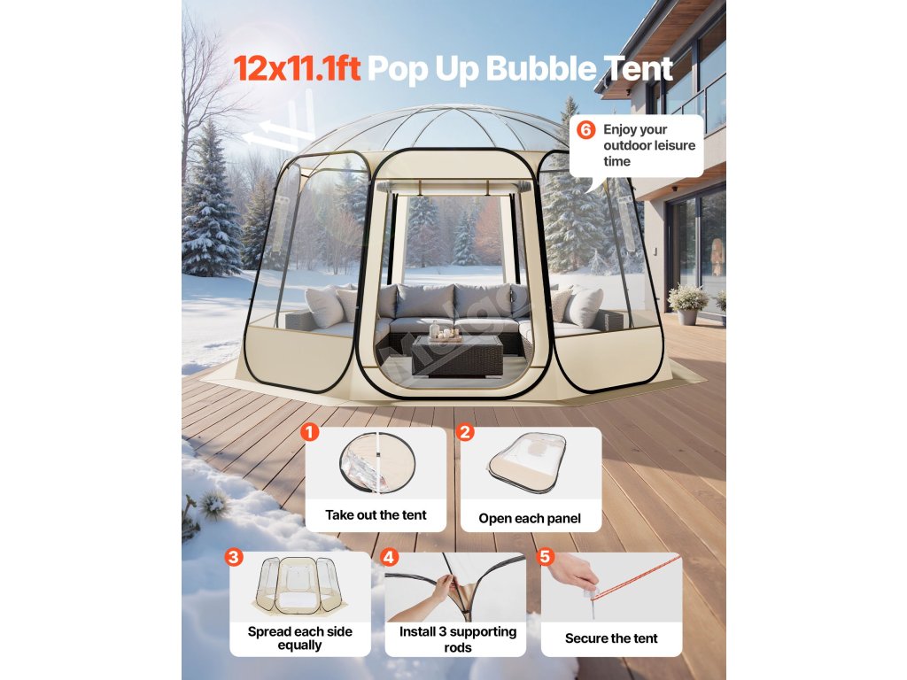 Tento pop-up bublinový stan pro 10-12 osob je vyroben z TPU a tkaniny 210D Oxford s ocelovou obručí pro zajištění stability a odolnosti. Pop-up konstrukce umožňuje rychlé sestavení během několika sekund, takže je ideální pro použití venku nebo na zahradě. Několik rolovacích bočních oken umožňuje snadnou regulaci proudění vzduchu a soukromí.