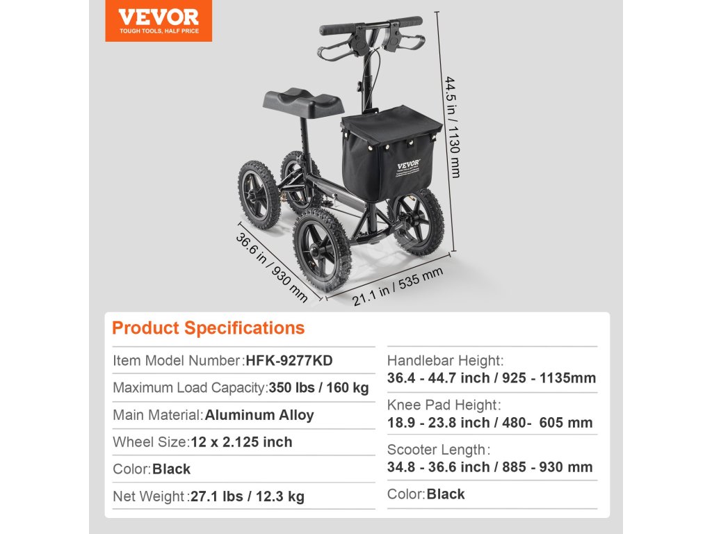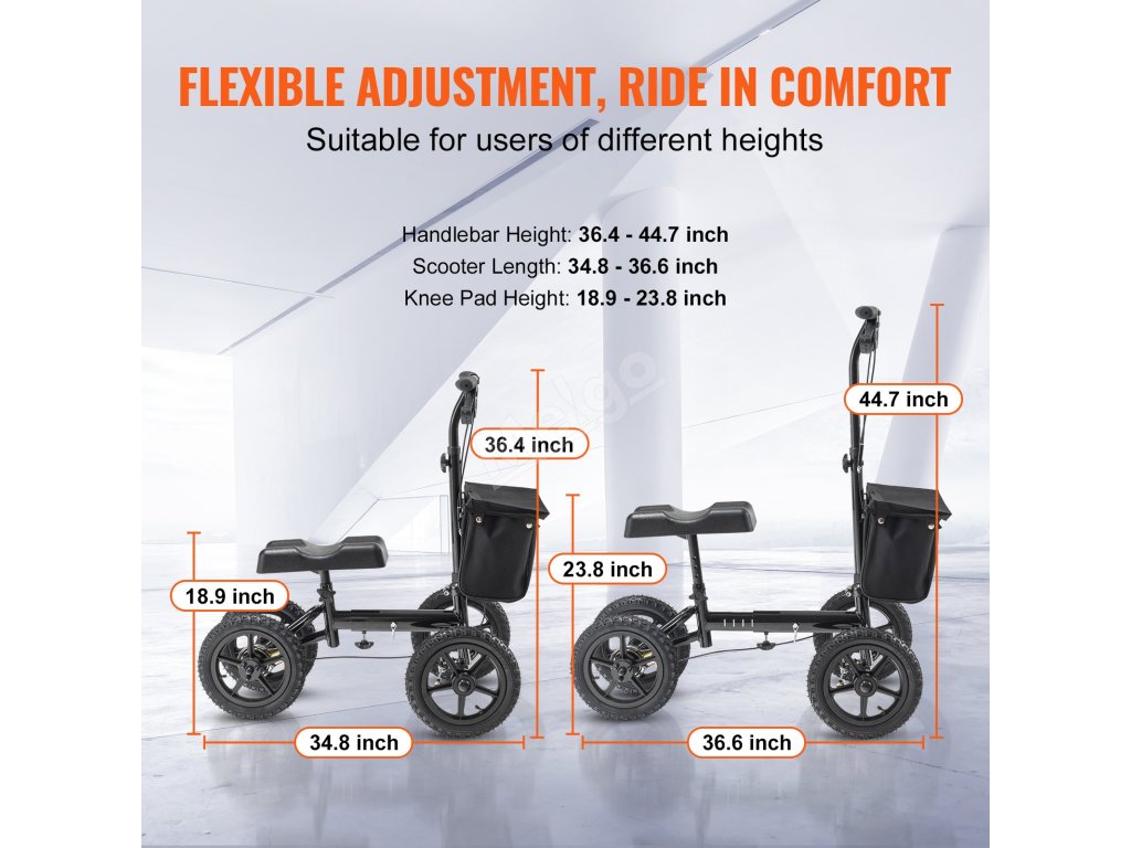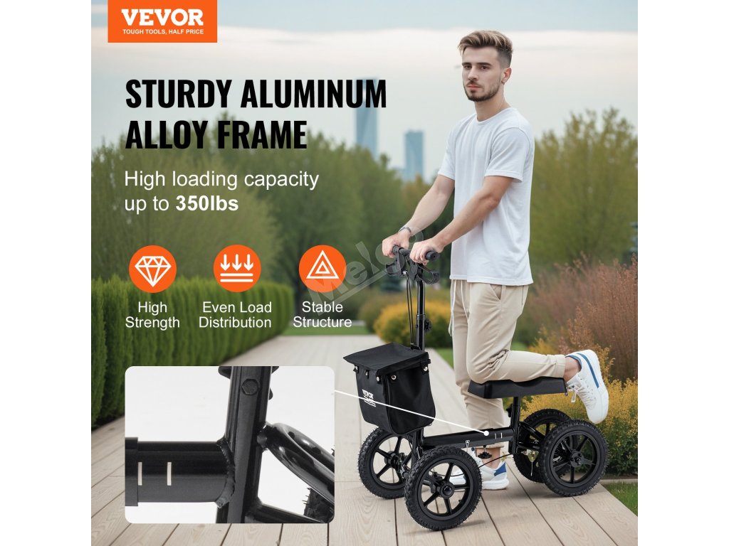 Zažijte bezkonkurenční podporu a pohodlí na své cestě za zotavením s koloběžkou VEVOR. Je navržen s odolným hliníkovým rámem a poskytuje spolehlivou oporu až do hmotnosti 350 kg. Užijte si individuální pohodlí díky nastavitelnému sloupku řízení a výšce kolenní podložky, které jsou přizpůsobeny vašim individuálním potřebám.