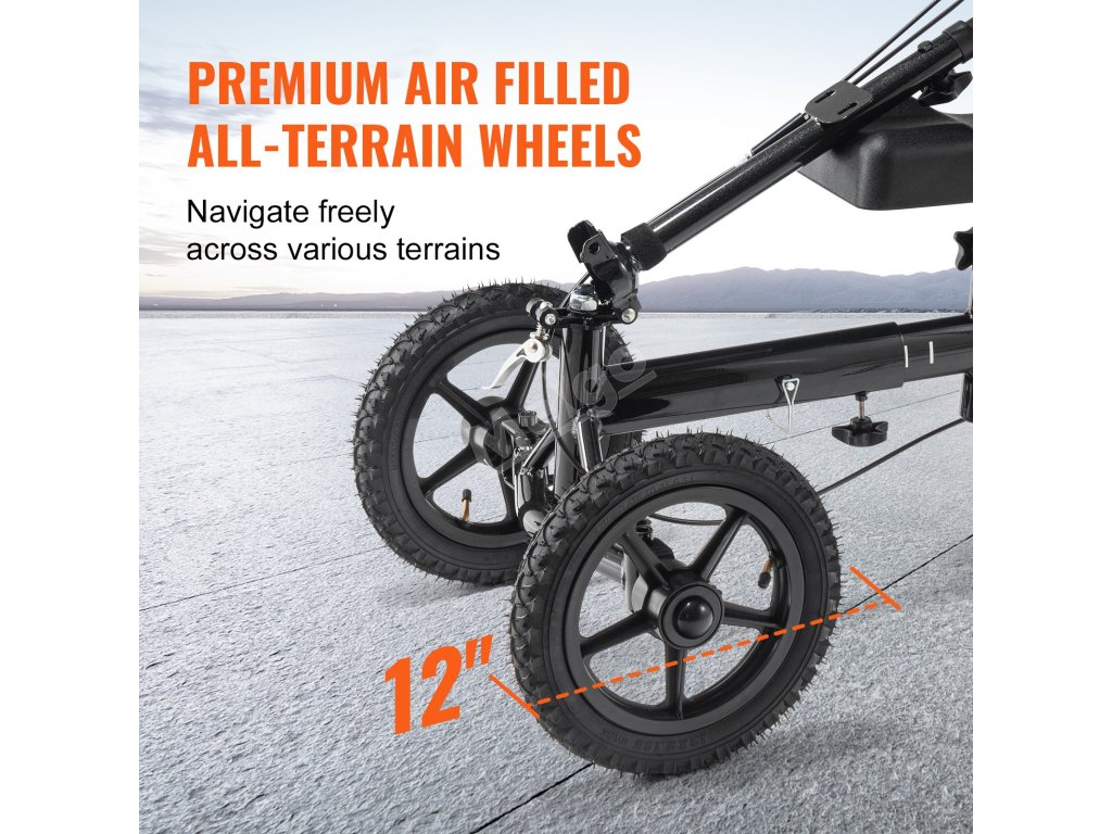 Náš hliníkový trakař je vybaven 12palcovými vzduchem plněnými koly vpředu i vzadu a zajišťuje stabilitu a esovitý pohyb na různých površích. Protiskluzový běhoun zlepšuje trakci a zajišťuje hladkou a bezpečnou jízdu.