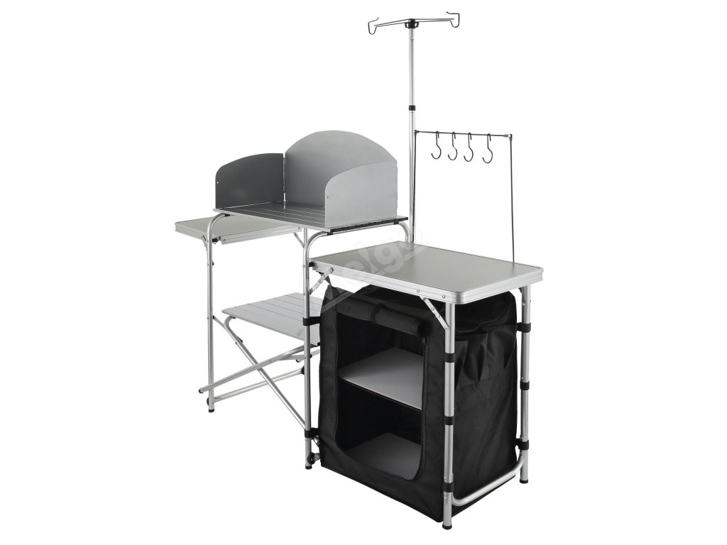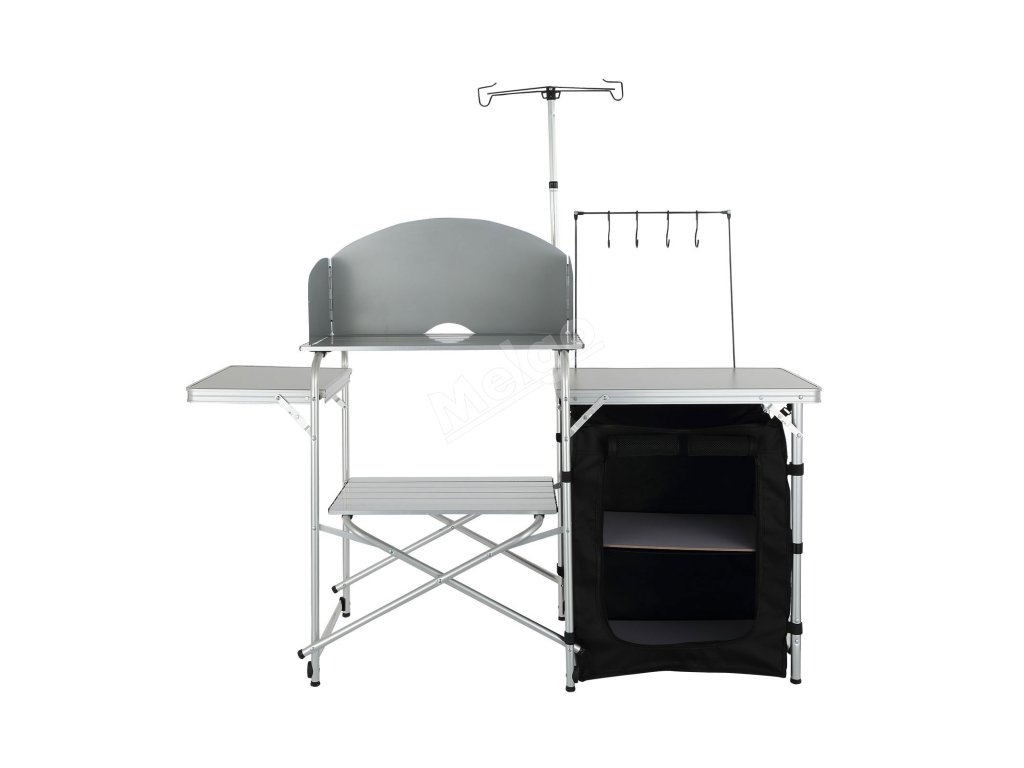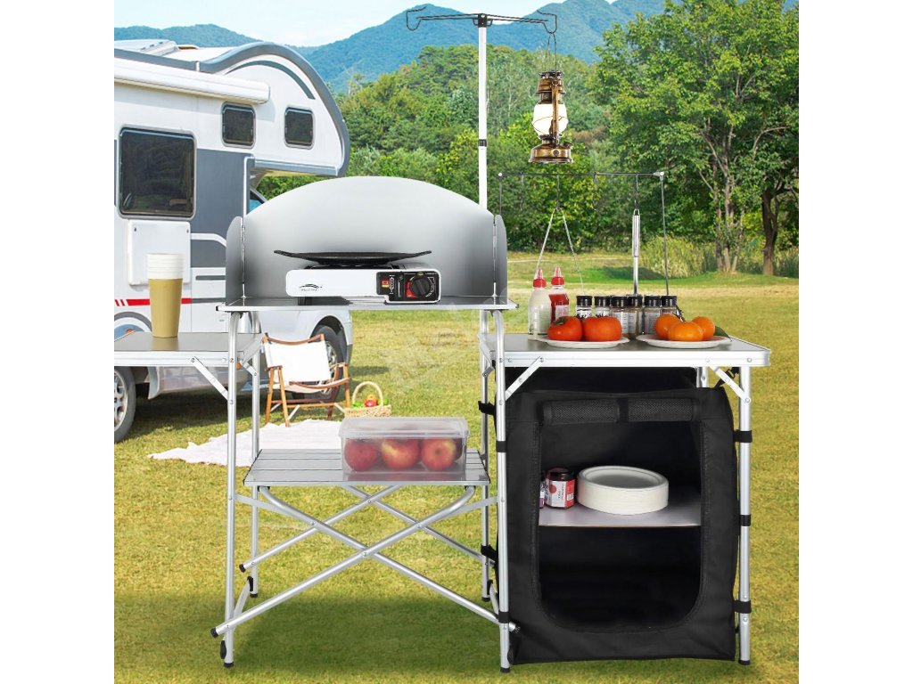 Skládací kempingový kuchyňský stůl s jednou skříňkou a větrným štítem