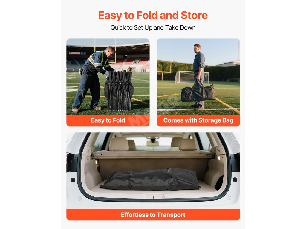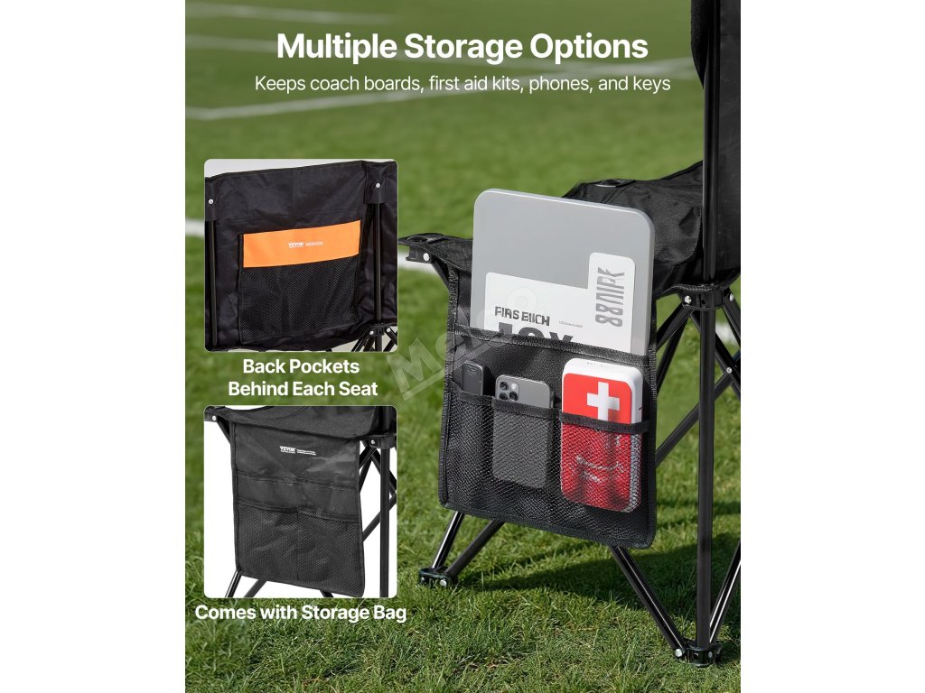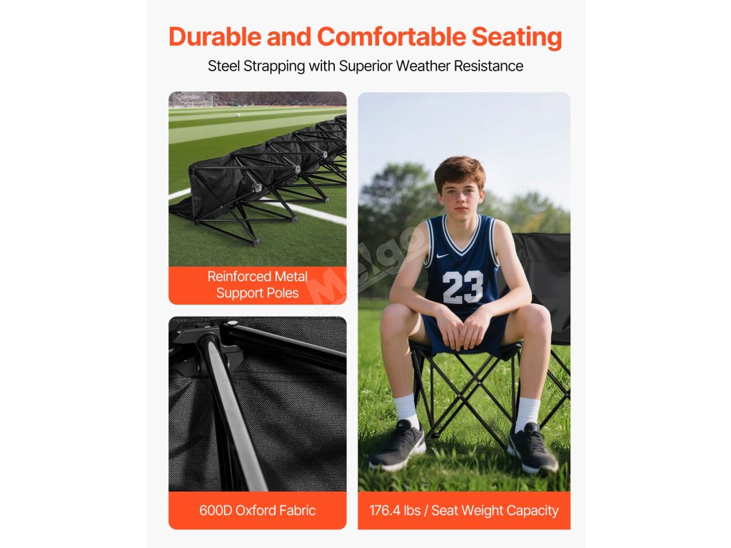 Tento produkt je vyroben z odolné tkaniny 600D oxford se zesílenými podpůrnými tyčemi pro větší pevnost a stabilitu. Díky skládací konstrukci je ideální pro sportovní akce, večírky, venkovní kempování nebo jakoukoli příležitost, kdy potřebujete posezení u postranní čáry.