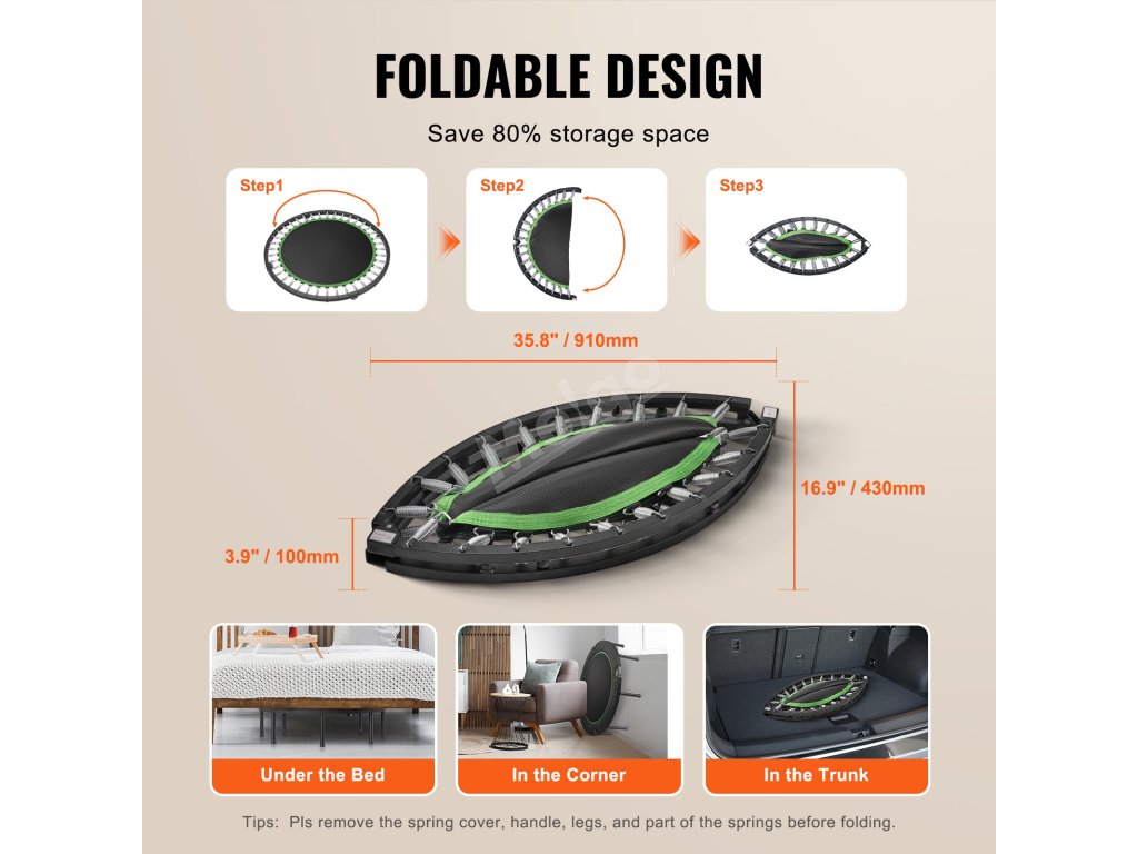 Optimalizujte svůj úložný prostor díky trampolíně na cvičení, která se složí na 80 % své původní velikosti. Snadno ji uložíte pod postel, pohovku, do rohu nebo dokonce do kufru auta.