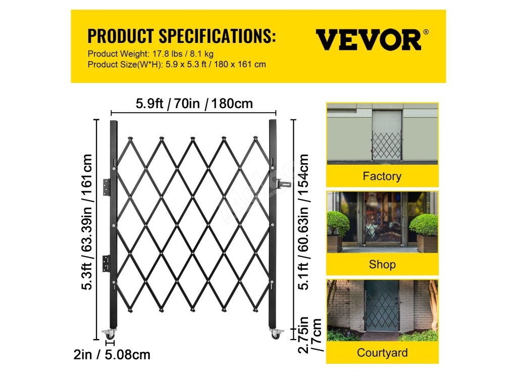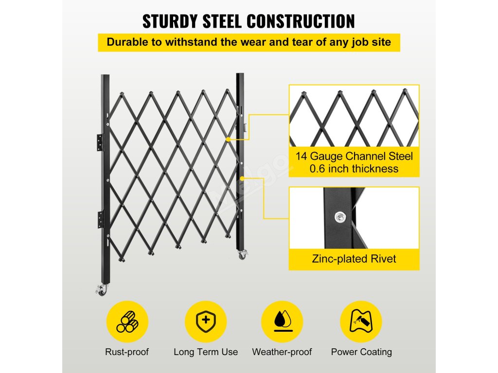 Jednoduchá skladacia bezpečnostná brána VEVOR je vyrobená s ohľadom na pevnosť. Je vyrobená z 3/4" kanálikovej ocele s hrúbkou 14 mm; ponúka pevnú bariéru pre akýkoľvek priestor. Jej pevná konštrukcia sťažuje narušiteľom manipuláciu s ňou. Oceľová konštrukcia zaručuje dlhodobé používanie, zatiaľ čo prášková povrchová úprava poskytuje dodatočnú odolnosť. Táto brána je ideálna na zabezpečenie vášho domu alebo firmy. Konštrukcia brány zaručuje, že odolá pokusom o prelomenie, poskytuje pokoj a spĺňa bezpečnostné potreby rôznych prostredí. Táto brána je spoľahlivou voľbou pre každého, kto chce zlepšiť svoje bezpečnostné opatrenia.