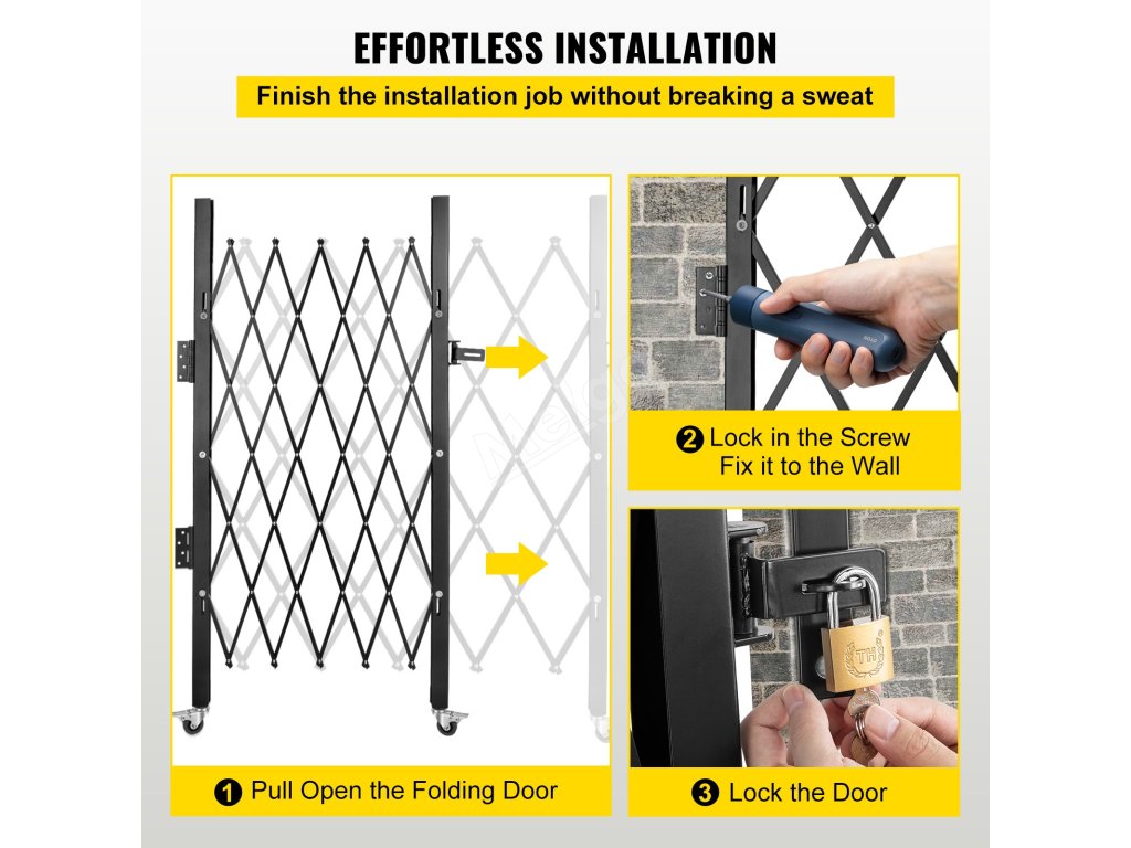 Inštalácia tejto skladacej bezpečnostnej brány je jednoduchá. Obsahuje všetok potrebný hardvér, vďaka čomu je proces inštalácie jednoduchý. Či už zabezpečujete svoj vlastný dom alebo firmu, jej jasné pokyny vás prevedú celým procesom. Konštrukcia brány umožňuje flexibilné použitie. Môžete ju nainštalovať na dvere, okná a ako deliacu stenu miestnosti. Vďaka svojej jednoduchej inštalácii sa dokonale hodí pre rôzne bezpečnostné potreby. Vďaka tomu je ideálna pre každého, kto hľadá rýchle a účinné bezpečnostné riešenie akéhokoľvek druhu. Prispôsobivosť brány zaručuje, že sa ľahko zmestí do rôznych priestorov. Spoľahlivé bezpečnostné opatrenie bez komplikovaného nastavovania je zabezpečené s ľahkosťou.
