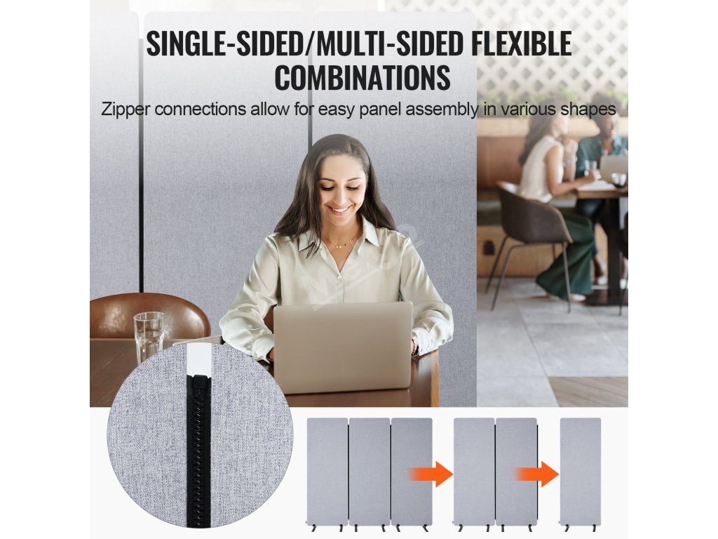 Tento přenosný rozdělovač místností je vybaven rychlou instalací na zip, která umožňuje jeho použití jako jednoho panelu v malých prostorách. Lze jej také kombinovat s dalšími panely a vytvořit tak větší, přizpůsobivou dočasnou stěnu, která nabízí flexibilitu vyhovující různým potřebám.